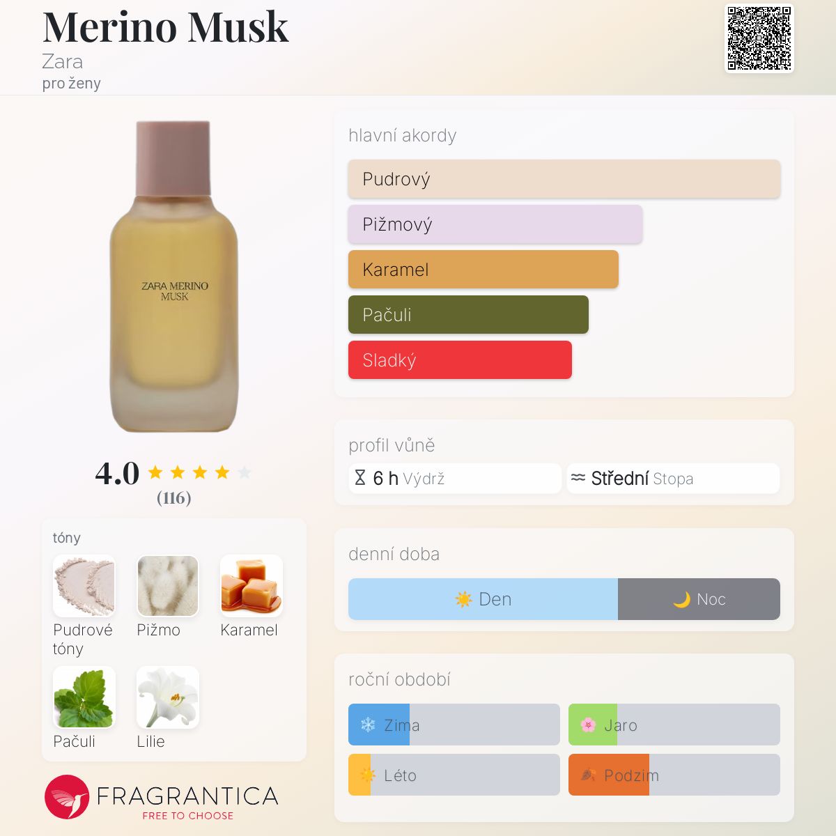 Merino Musk podle Zara je Orientální Vanilla vůně pro ženy. Toto je nová vůně. Merino Musk byl/a uveden/a v roce 2024. Vrchní tóny jsou Pudrové tóny a Lilie; střední tón jePižmo ; základní tóny jsou Karamel a Pačuli.
