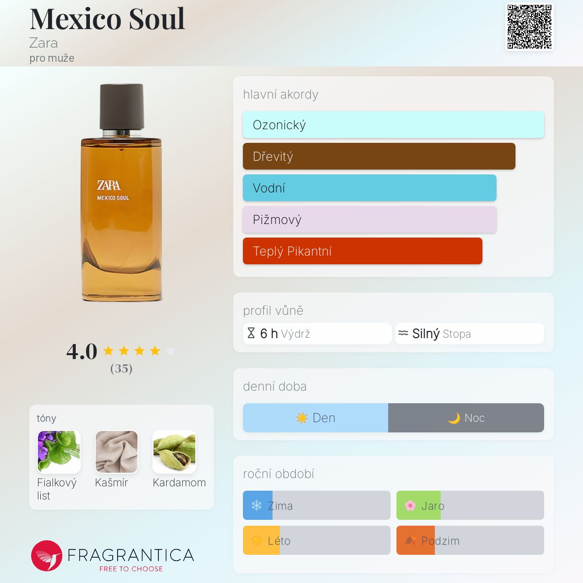 Mexico Soul podle Zara je Woody Spicy vůně pro muže. Mexico Soul byl/a uveden/a v roce 2019. Vrchní tón je Fialkový list ; střední tón jeKardamom ; základní tón je Kašmír.