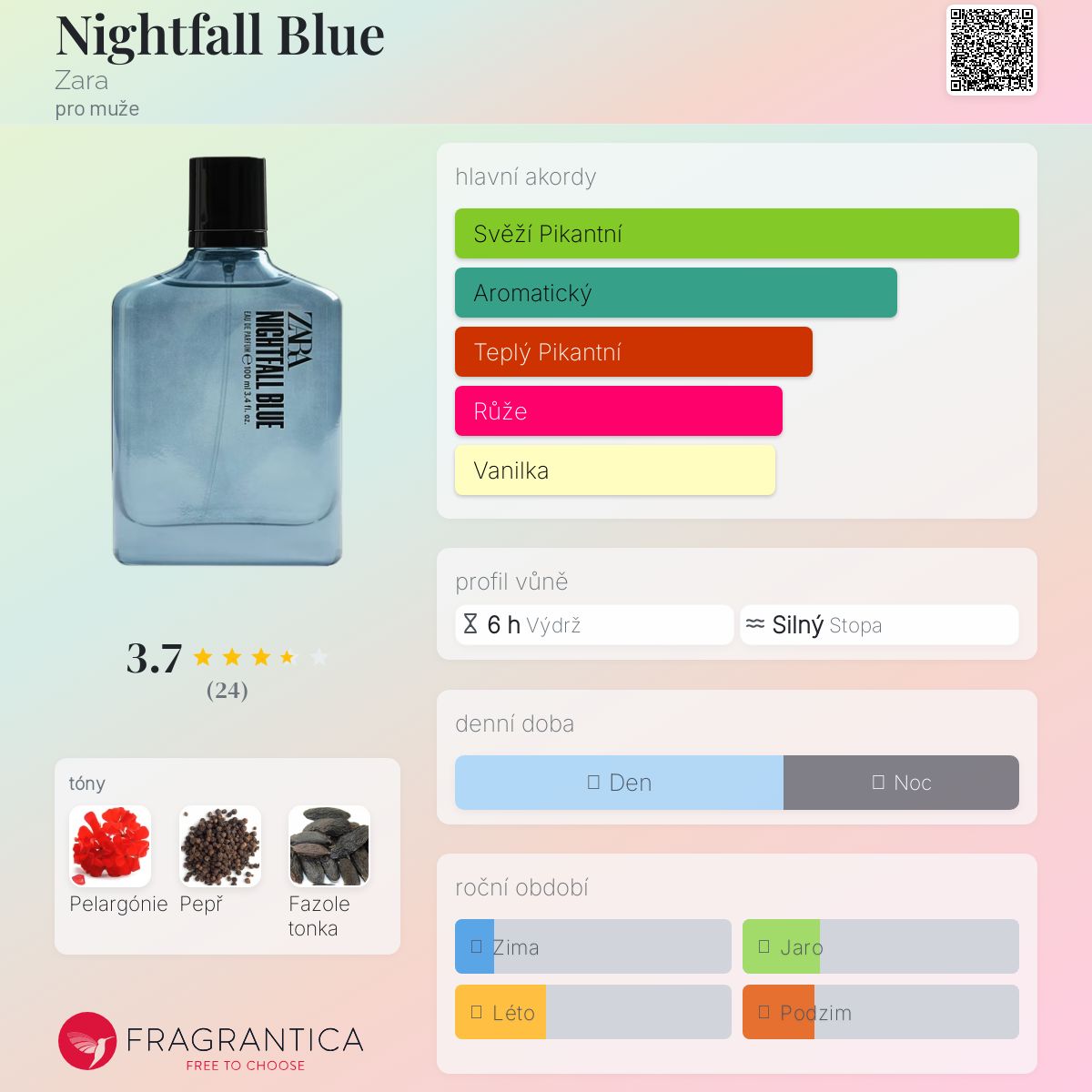 Nightfall Blue podle Zara je Orientální Spicy vůně pro muže. Nightfall Blue byl/a uveden/a v roce 2020. Vrchní tón je Černý pepř ; střední tón jePelargónie ; základní tón je Fazole tonka.