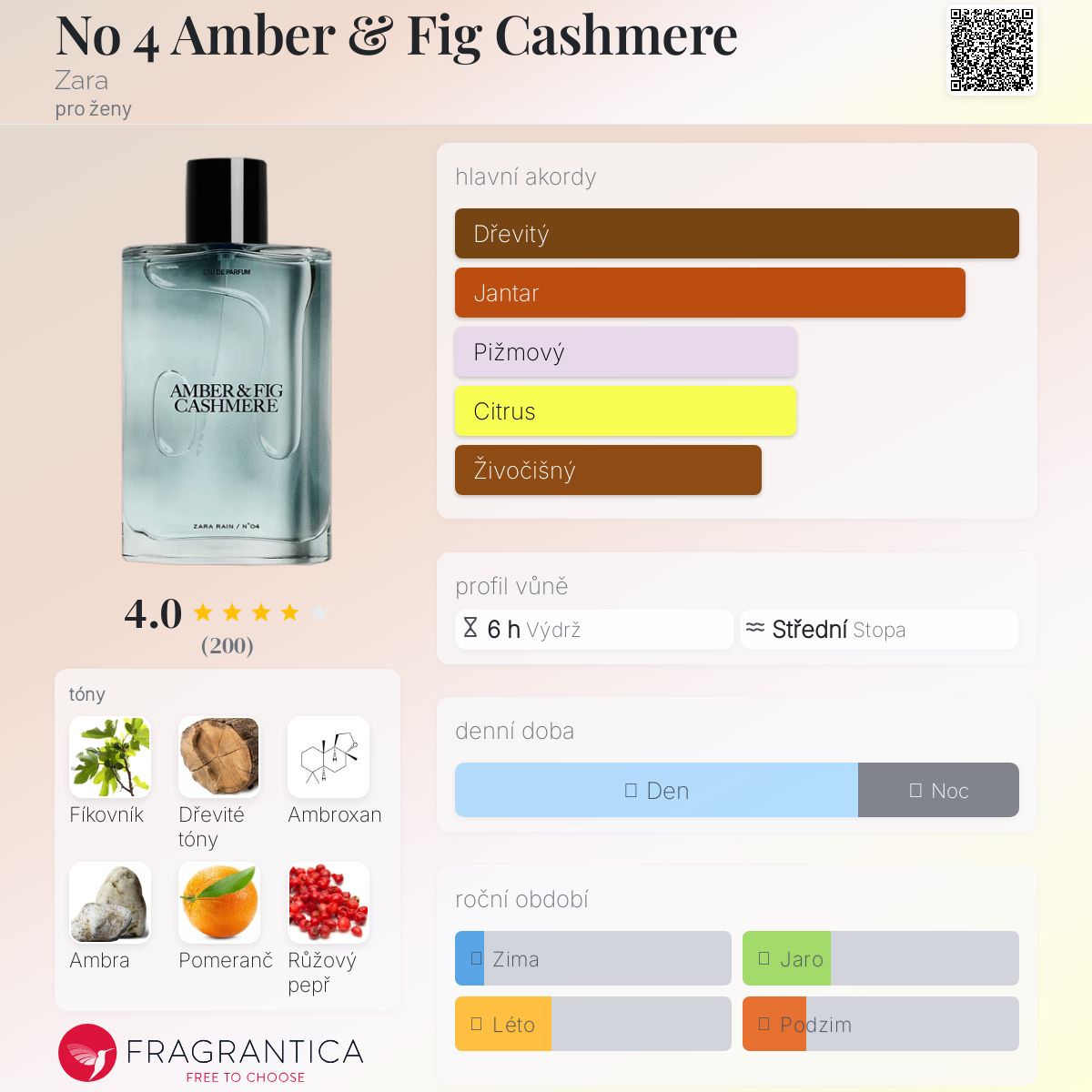 No 4 Amber & Fig Cashmere podle Zara je Woody Aromatic vůně pro ženy. No 4 Amber & Fig Cashmere byl/a uveden/a v roce 2021. "Nosem" za touto vůní je Jo Malone. Vrchní tóny jsou Pomeranč a Růžový pepř; střední tóny jsouFíkovník a Bílé dřevo ; základní tóny jsou Ambroxan, Ambra a Pačuli.