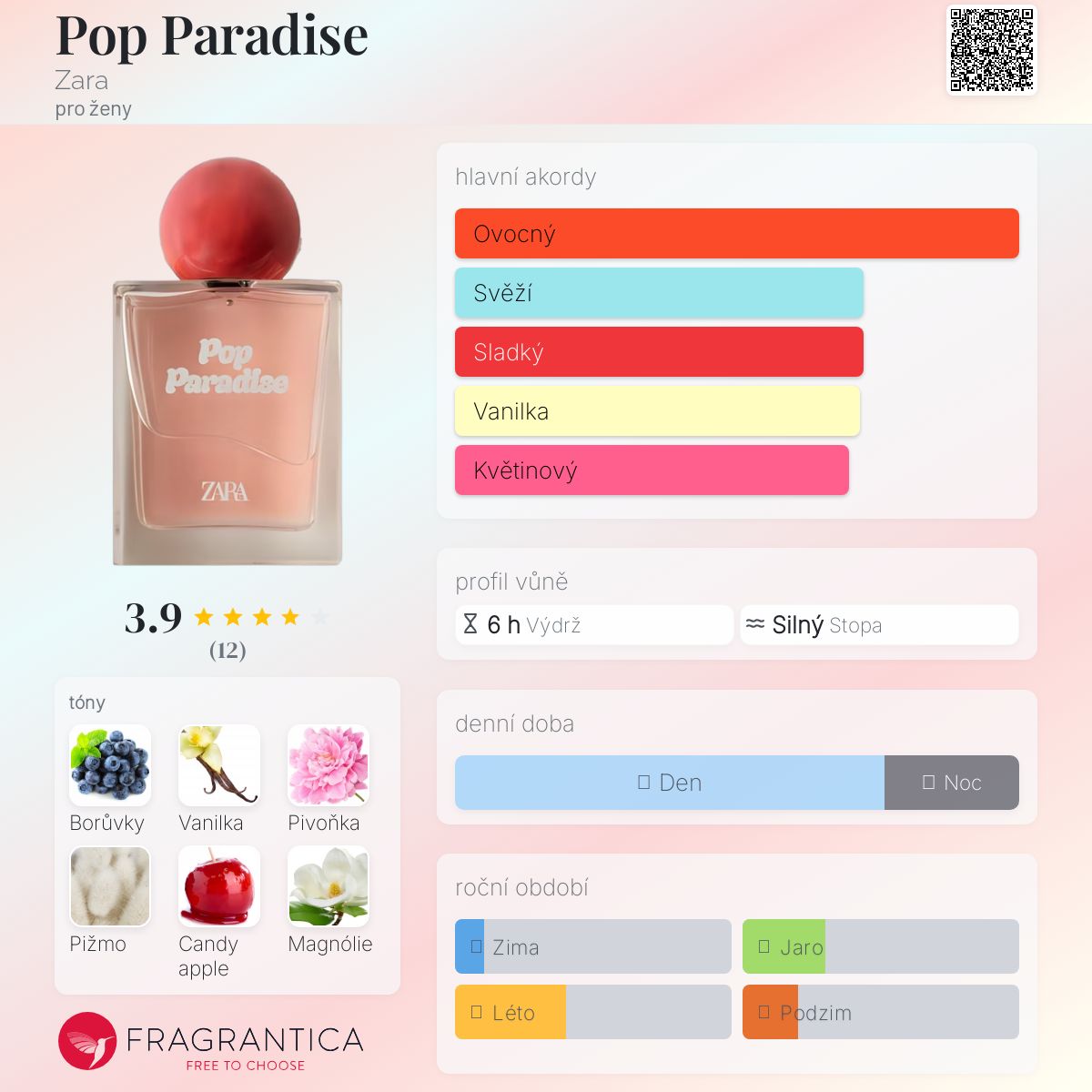 Pop Paradise podle Zara je Floral Fruity Gourmand vůně pro ženy. Pop Paradise byl/a uveden/a v roce 2023. Vrchní tóny jsou Borůvky a Sladké jablko; střední tóny jsouPivoňka, Magnólie a Fialka ; základní tóny jsou Vanilka a Pižmo.