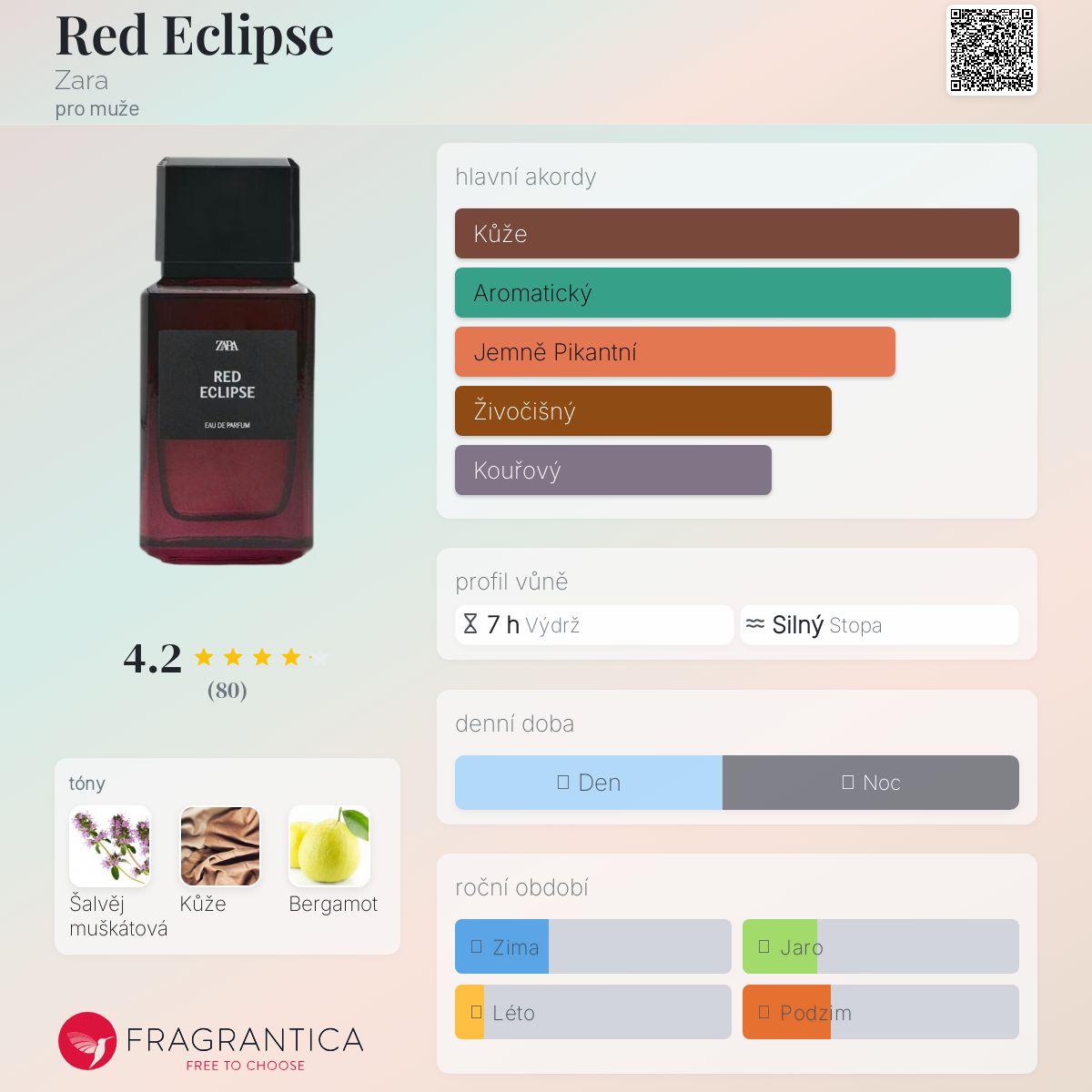 Red Eclipse podle Zara je Leather vůně pro muže. Toto je nová vůně. Red Eclipse byl/a uveden/a v roce 2025. Vrchní tón je Bergamot ; střední tón jeŠalvěj muškátová ; základní tón je Kůže.