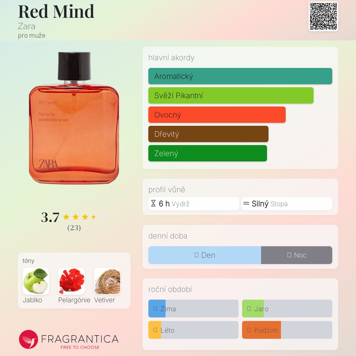 Red Mind podle Zara je Aromatic vůně pro muže. Red Mind byl/a uveden/a v roce 2019. Vrchní tón je Jablko ; střední tón jePelargónie ; základní tón je Vetiver.