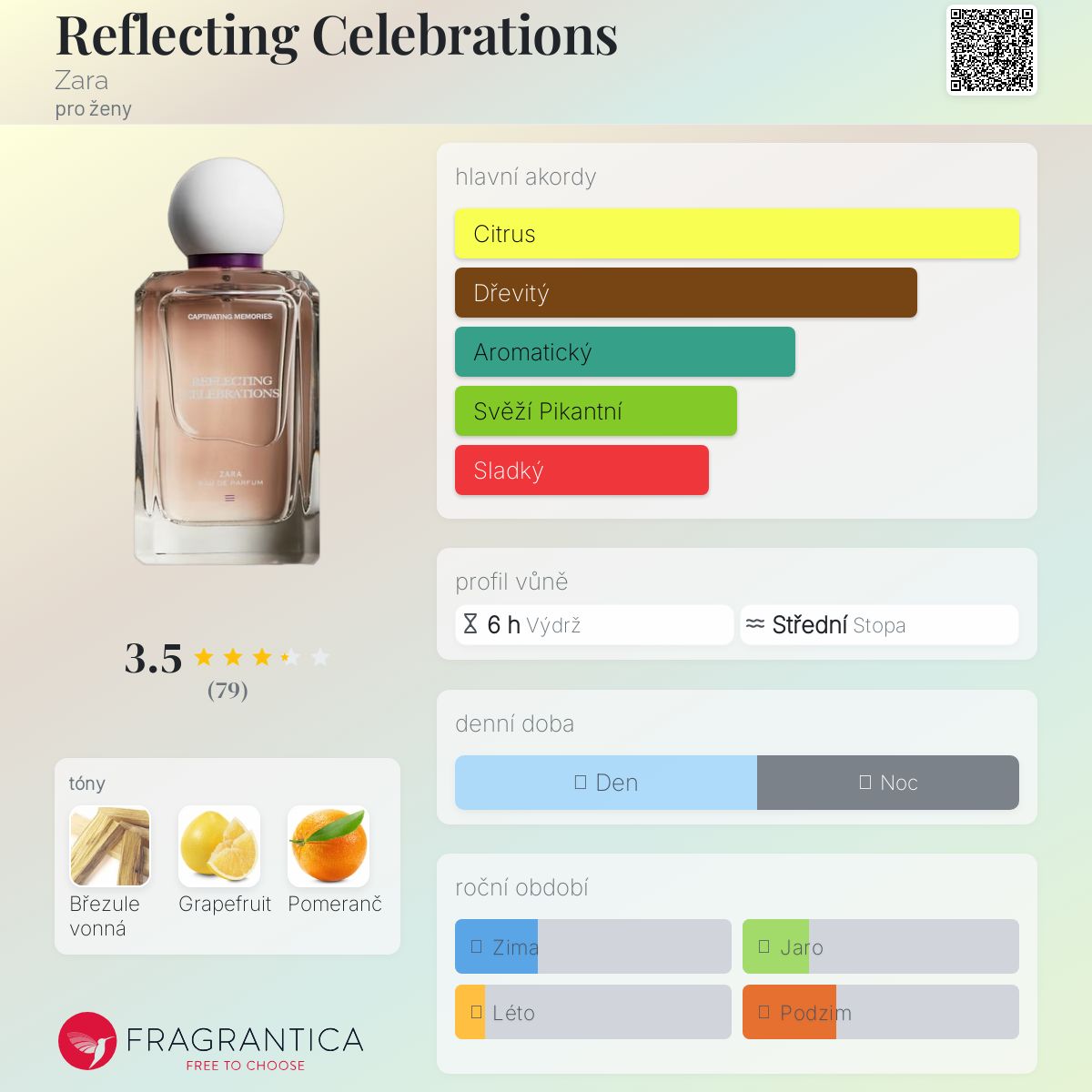 Reflecting Celebrations podle Zara je vůně pro ženy. Reflecting Celebrations byl/a uveden/a v roce 2022. "Nosem" za touto vůní je Jo Malone. Vrchní tón je Grapefruit ; střední tón jePomeranč ; základní tón je Březule vonná.