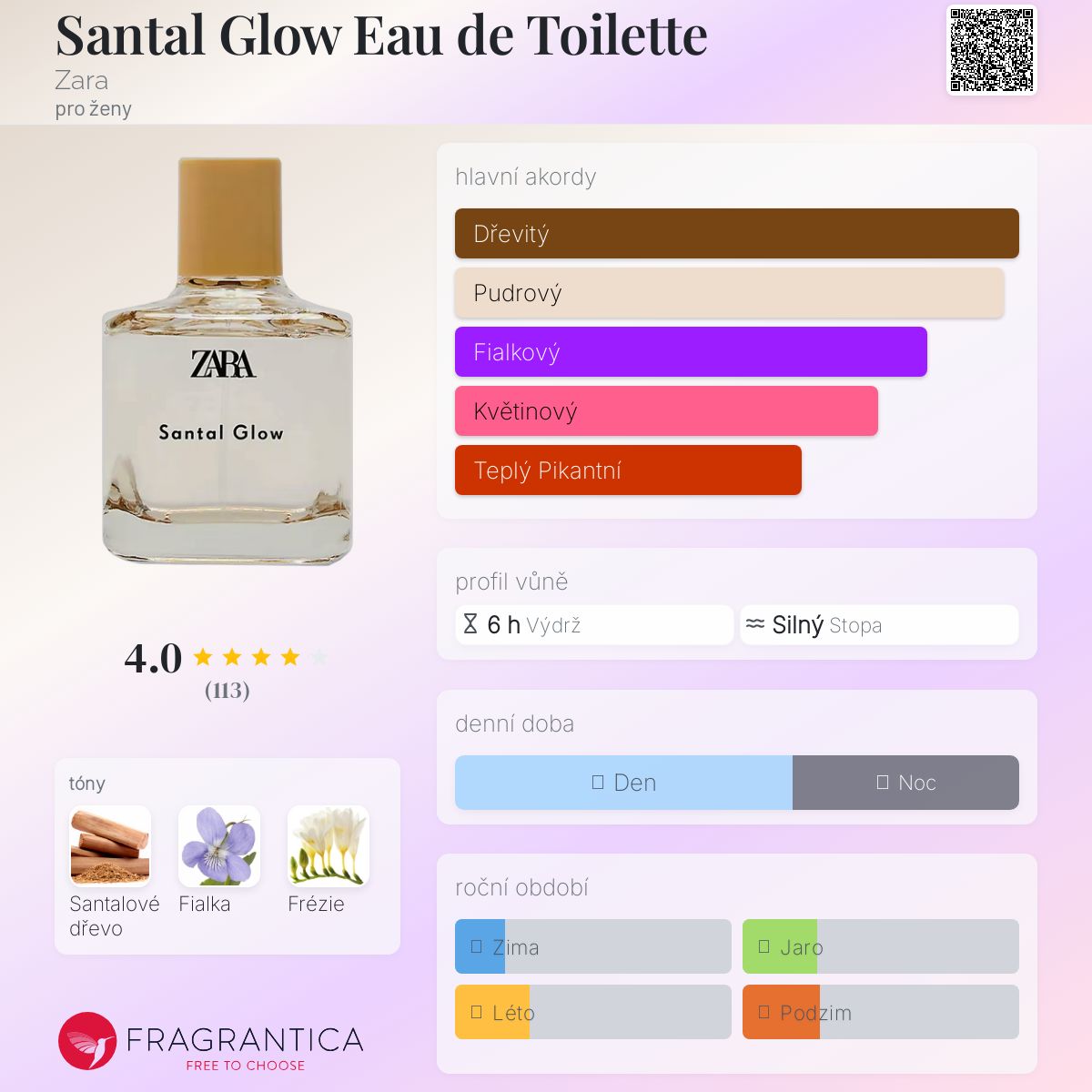 Santal Glow Eau de Toilette podle Zara je Floral vůně pro ženy. Santal Glow Eau de Toilette byl/a uveden/a v roce 2020. Vrchní tón je Frézie ; střední tón jeFialka ; základní tón je Santalové dřevo.