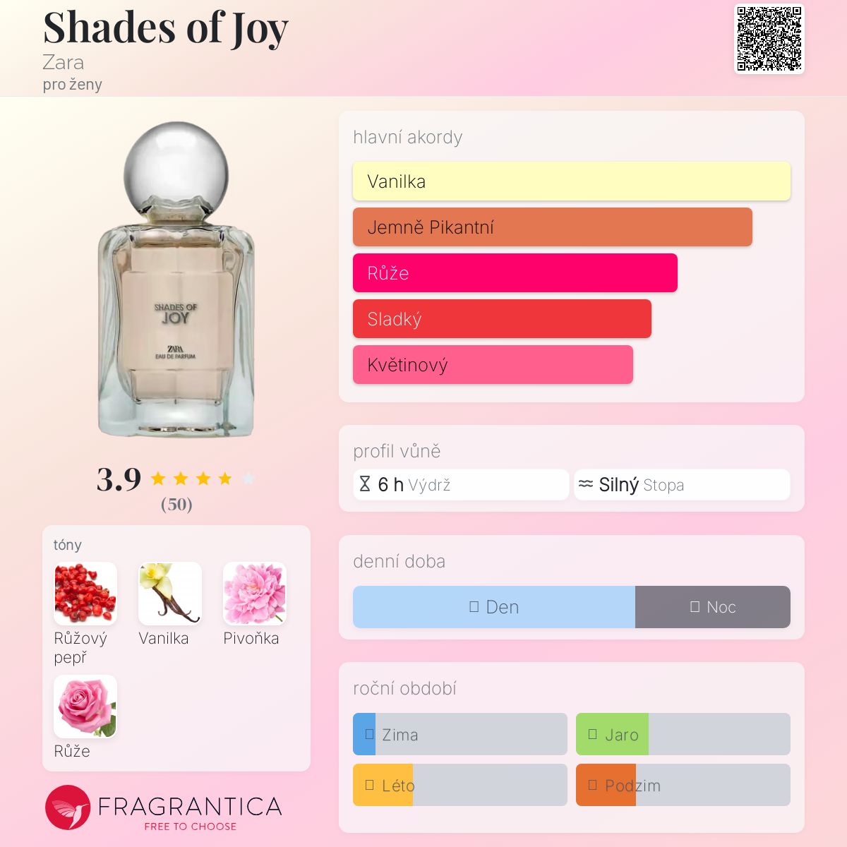 Shades of Joy podle Zara je Orientální Floral vůně pro ženy. Toto je nová vůně. Shades of Joy byl/a uveden/a v roce 2024. Vrchní tón je Růžový pepř ; střední tóny jsouPivoňka a Růže ; základní tón je Vanilka.