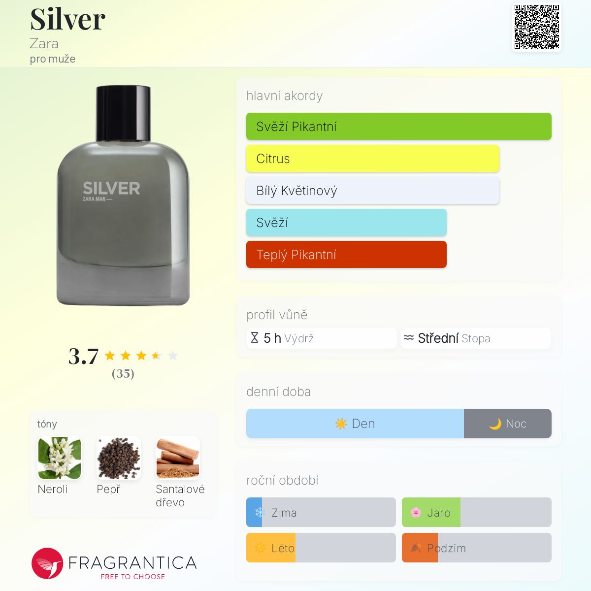Silver podle Zara je Woody Aromatic vůně pro muže. Silver byl/a uveden/a v roce 2021. Vrchní tón je Neroli ; střední tón jePepř ; základní tón je Santalové dřevo.