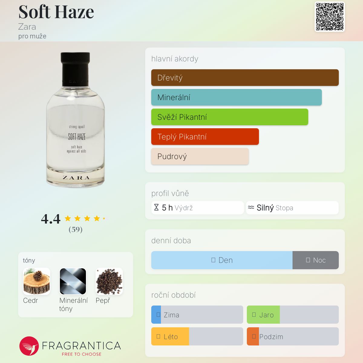 Soft Haze podle Zara je Woody Aromatic vůně pro muže. Soft Haze byl/a uveden/a v roce 2018. Vrchní tón je Minerální tóny ; střední tón jeČerný pepř ; základní tón je Cedr.