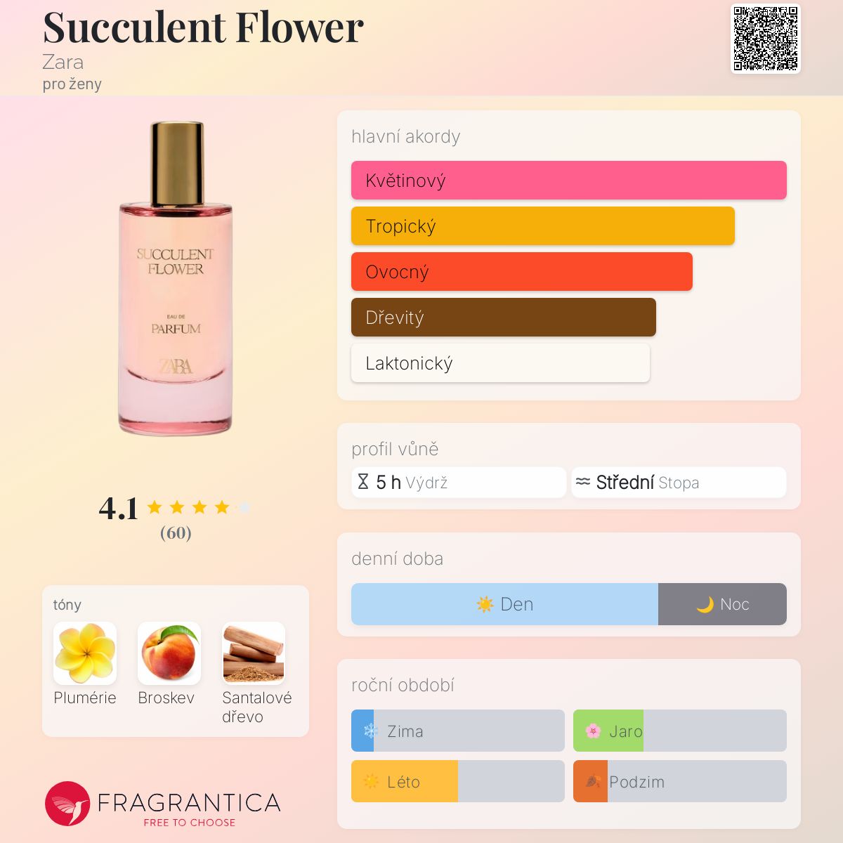 Succulent Flower podle Zara je Floral Fruity vůně pro ženy. Toto je nová vůně. Succulent Flower byl/a uveden/a v roce 2025. Vrchní tón je Broskev ; střední tón jePlumérie ; základní tón je Santalové dřevo.