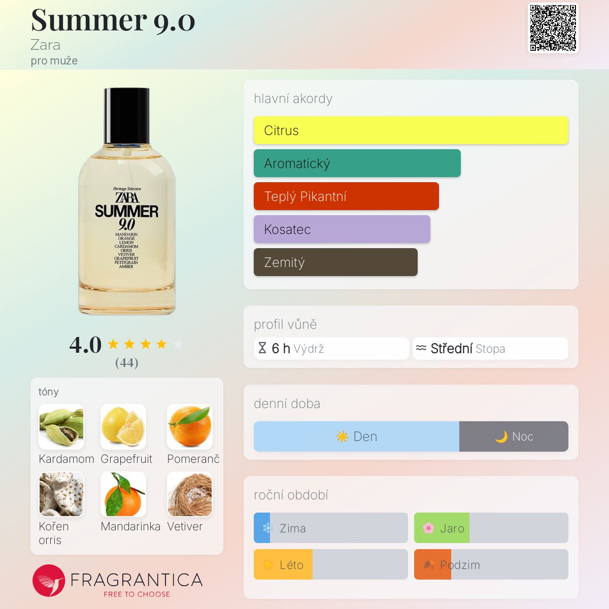 Summer 9.0 podle Zara je Citrus Aromatic vůně pro muže. Summer 9.0 byl/a uveden/a v roce 2021. "Nosem" za touto vůní je Amandine Galliano. Vrchní tóny jsou Pomeranč, Mandarinka a Citrón; střední tóny jsouKardamom, Orris a Vetiver ; základní tóny jsou Grapefruit, Petitgrain a Jantar (ambra).