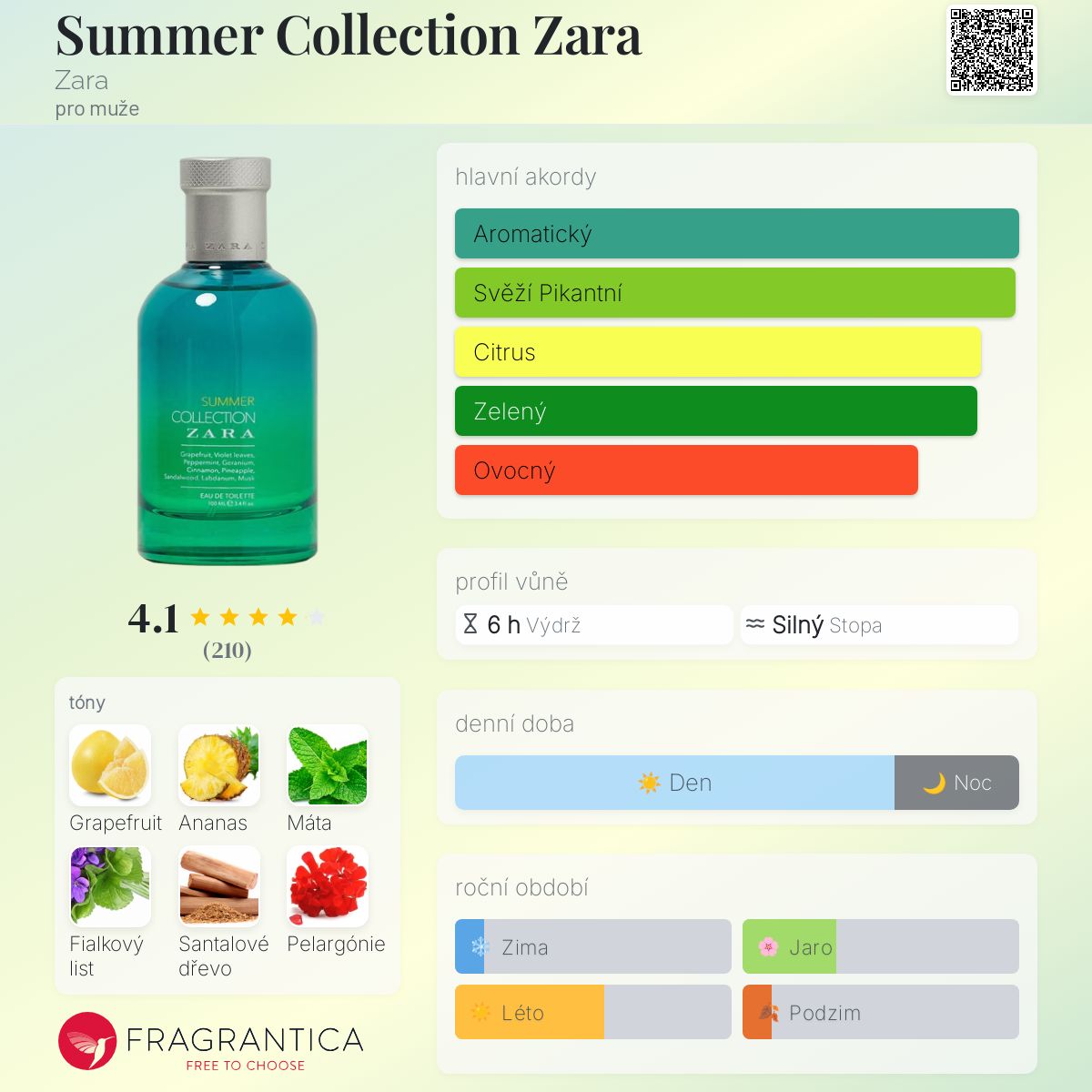 Summer Collection Zara podle Zara je Aromatic vůně pro muže. Summer Collection Zara byl/a uveden/a v roce 2017. Vrchní tóny jsou Grapefruit, Máta a Fialkové listy; střední tóny jsouAnanas, Pelargónie a Skořice ; základní tóny jsou Santalové dřevo, Pižmo a Labdanum.