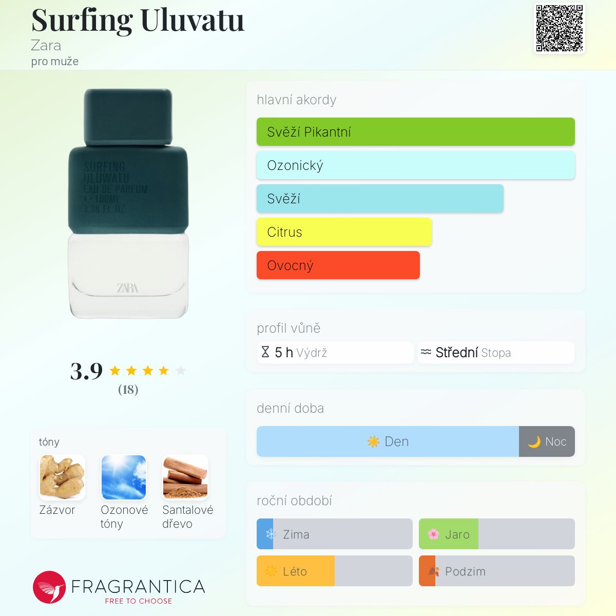 Surfing Uluvatu podle Zara je Woody Aromatic vůně pro muže. Toto je nová vůně. Surfing Uluvatu byl/a uveden/a v roce 2025. Vrchní tón je Zázvor ; střední tón jeOzonové tóny ; základní tón je Santalové dřevo.
