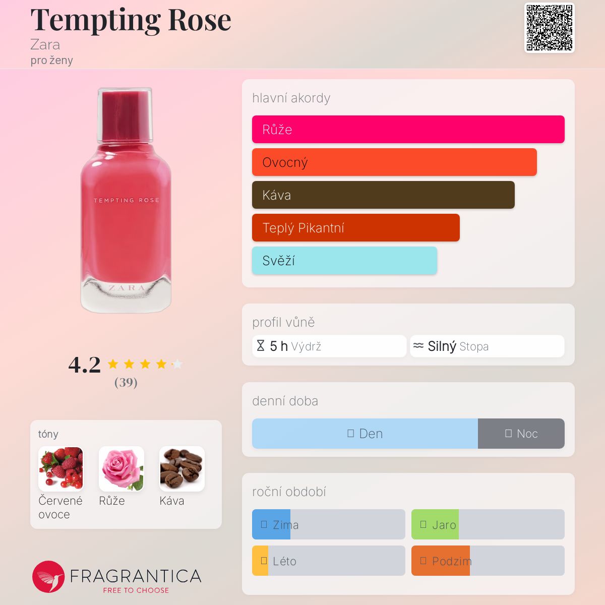 Tempting Rose podle Zara je Floral Fruity Gourmand vůně pro ženy. Tempting Rose byl/a uveden/a v roce 2018. Vrchní tón je Červené ovoce ; střední tón jeRůže ; základní tón je Káva.