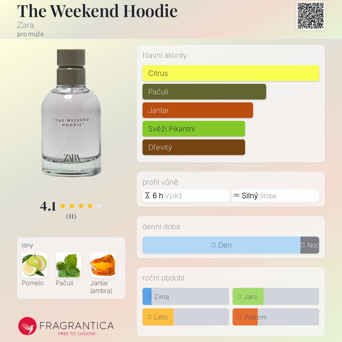 The Weekend Hoodie podle Zara je Orientální Woody vůně pro muže. The Weekend Hoodie byl/a uveden/a v roce 2019. Vrchní tón je Pomelo ; střední tón jePačuli ; základní tón je Jantar (ambra).