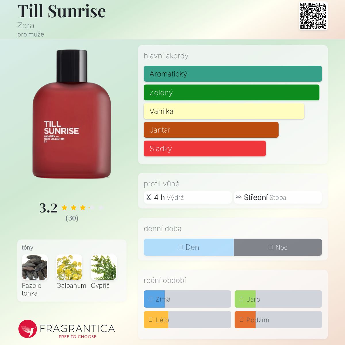 Till Sunrise podle Zara je Orientální Woody vůně pro muže. Till Sunrise byl/a uveden/a v roce 2021. Vrchní tón je Galbanum ; střední tón jeCypřiš ; základní tón je Fazole tonka.