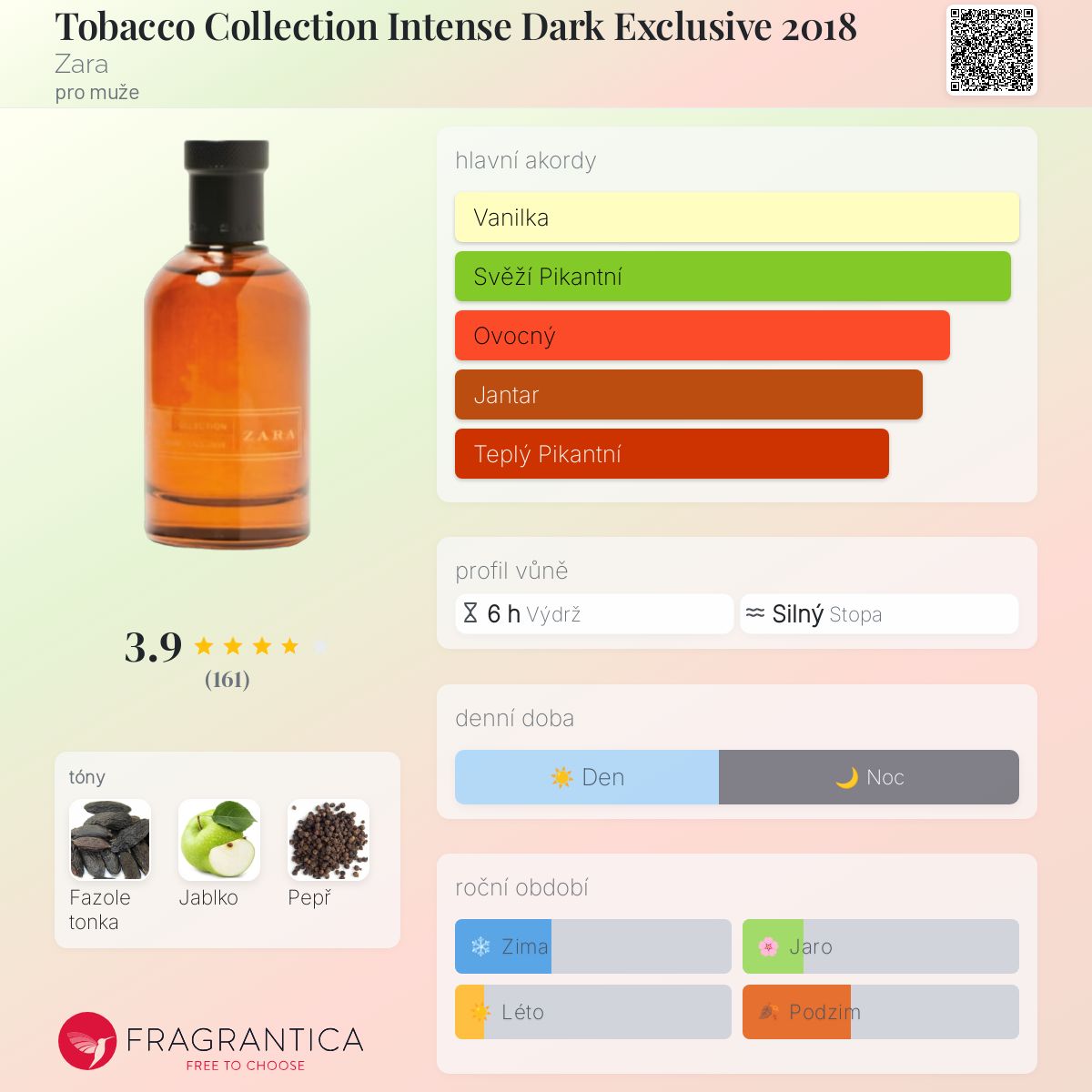 Tobacco Collection Intense Dark Exclusive 2018 podle Zara je Orientální vůně pro muže. Tobacco Collection Intense Dark Exclusive 2018 byl/a uveden/a v roce 2018. Vrchní tón je Jablko ; střední tón jeČerný pepř ; základní tón je Fazole tonka.