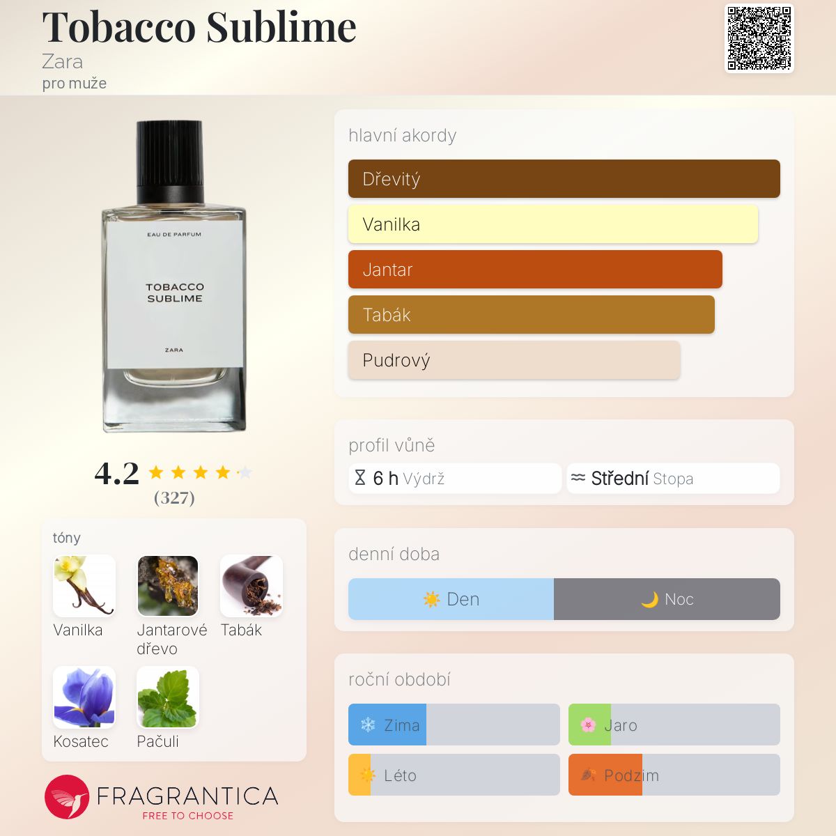 Tobacco Sublime podle Zara je vůně pro muže. Tobacco Sublime byl/a uveden/a v roce 2023. "Nosem" za touto vůní je Jordi Fernández. Vrchní tón je Tabák ; střední tóny jsouKosatec a Pačuli ; základní tóny jsou Vanilka a Jantarové dřevo.