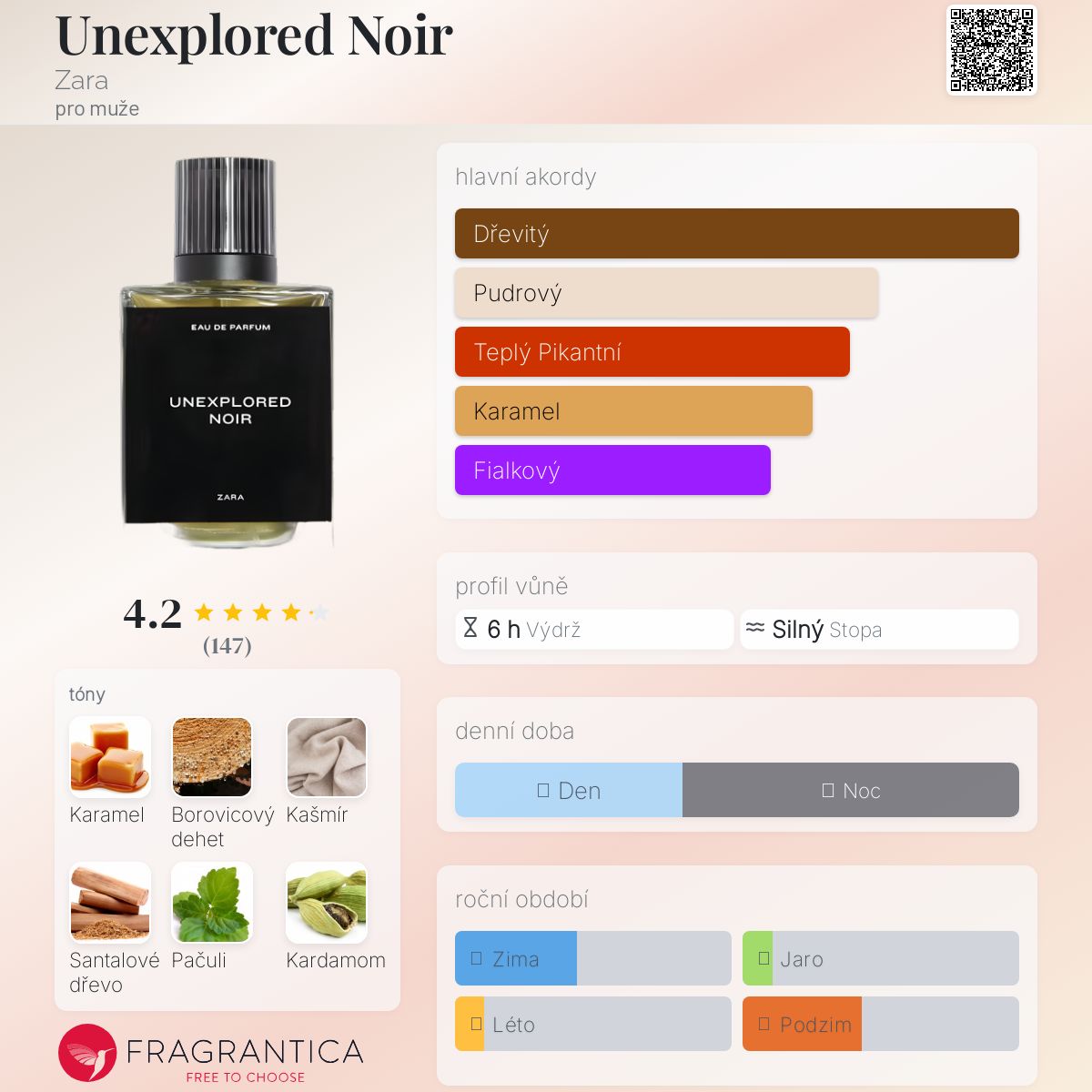 Unexplored Noir podle Zara je Woody vůně pro muže. Unexplored Noir byl/a uveden/a v roce 2023. "Nosem" za touto vůní je Marion Costero. Vrchní tóny jsou Kardamom a Růžový pepř; střední tóny jsouBorovicový dehet, Kašmír, Kosatec a Fialka ; základní tóny jsou Karamel, Santalové dřevo a Pačuli.