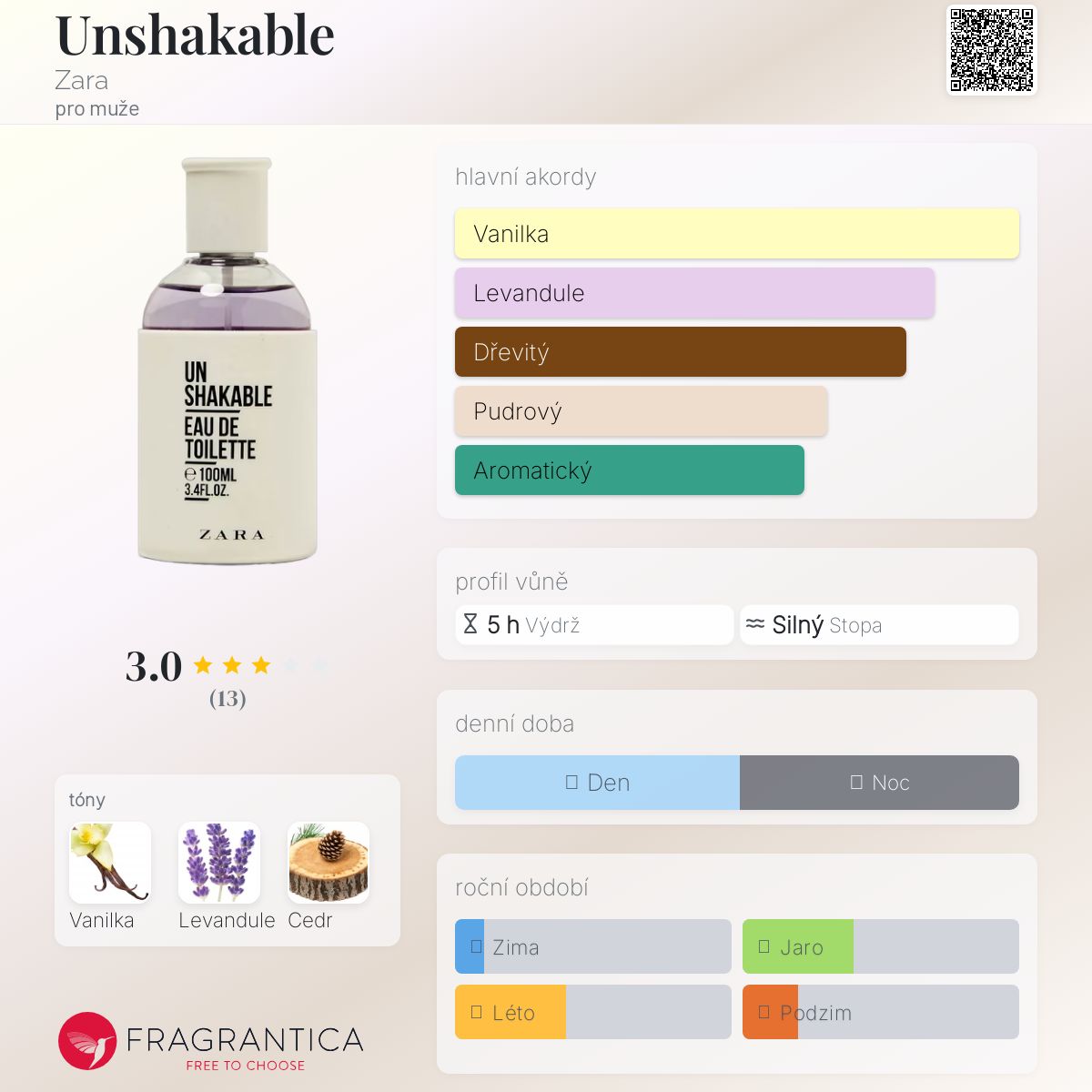 Unshakable podle Zara je Woody Aromatic vůně pro muže. Unshakable byl/a uveden/a v roce 2018. Vrchní tón je Levandule ; střední tón jeCedr ; základní tón je Vanilka.