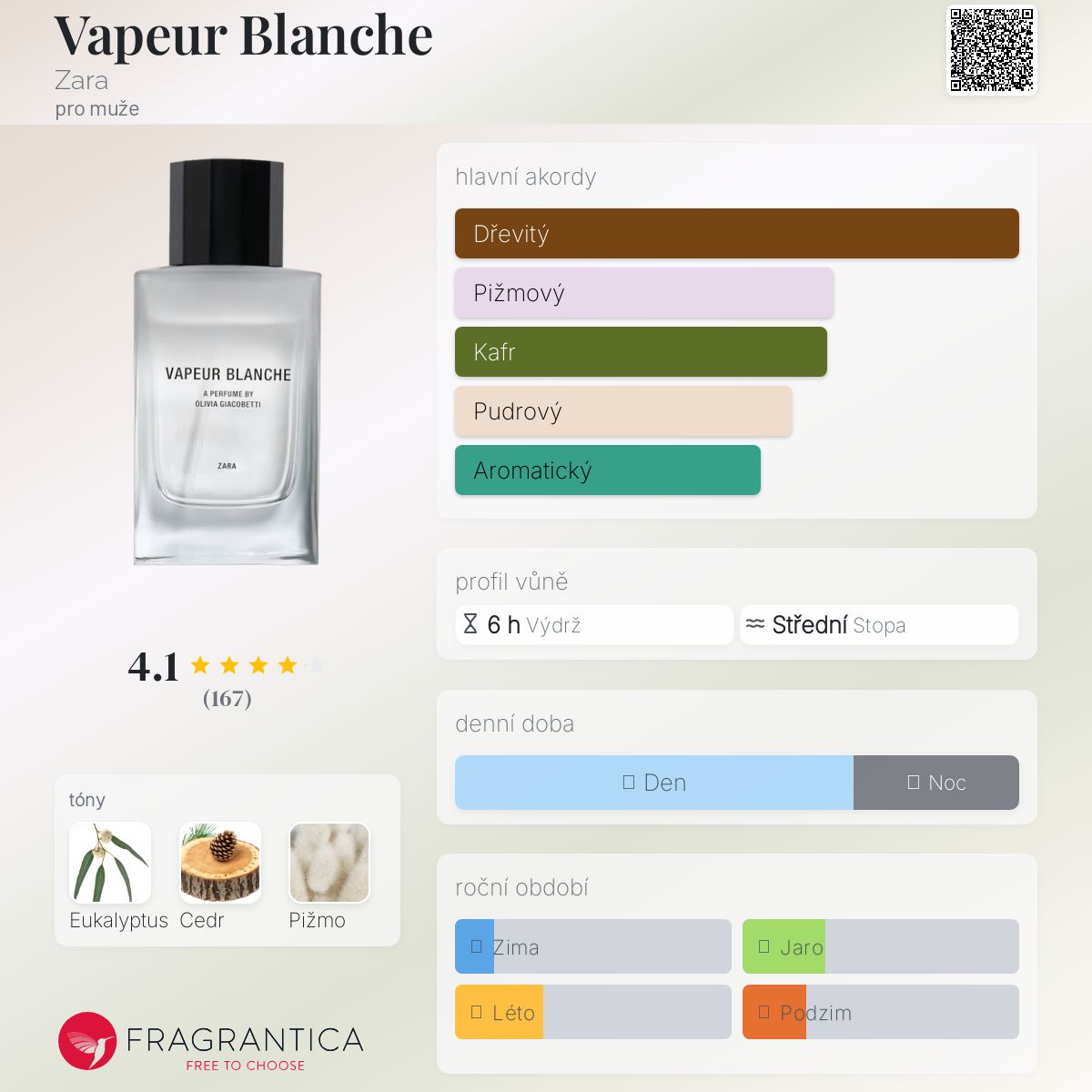 Vapeur Blanche podle Zara je vůně pro muže. Vapeur Blanche byl/a uveden/a v roce 2023. "Nosem" za touto vůní je Olivia Giacobetti. Vrchní tón je Eukalyptus ; střední tón jeCedr ; základní tón je Pižmo.