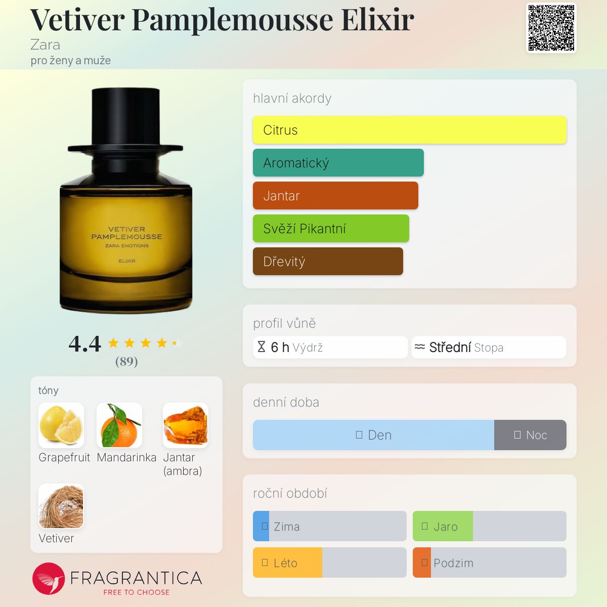 Vetiver Pamplemousse Elixir podle Zara je Citrus Aromatic vůně pro ženy a muže. Toto je nová vůně. Vetiver Pamplemousse Elixir byl/a uveden/a v roce 2025. "Nosem" za touto vůní je Jo Malone. Vrchní tón je Grapefruit ; střední tón jeMandarinka ; základní tóny jsou Jantar (ambra) a Vetiver.