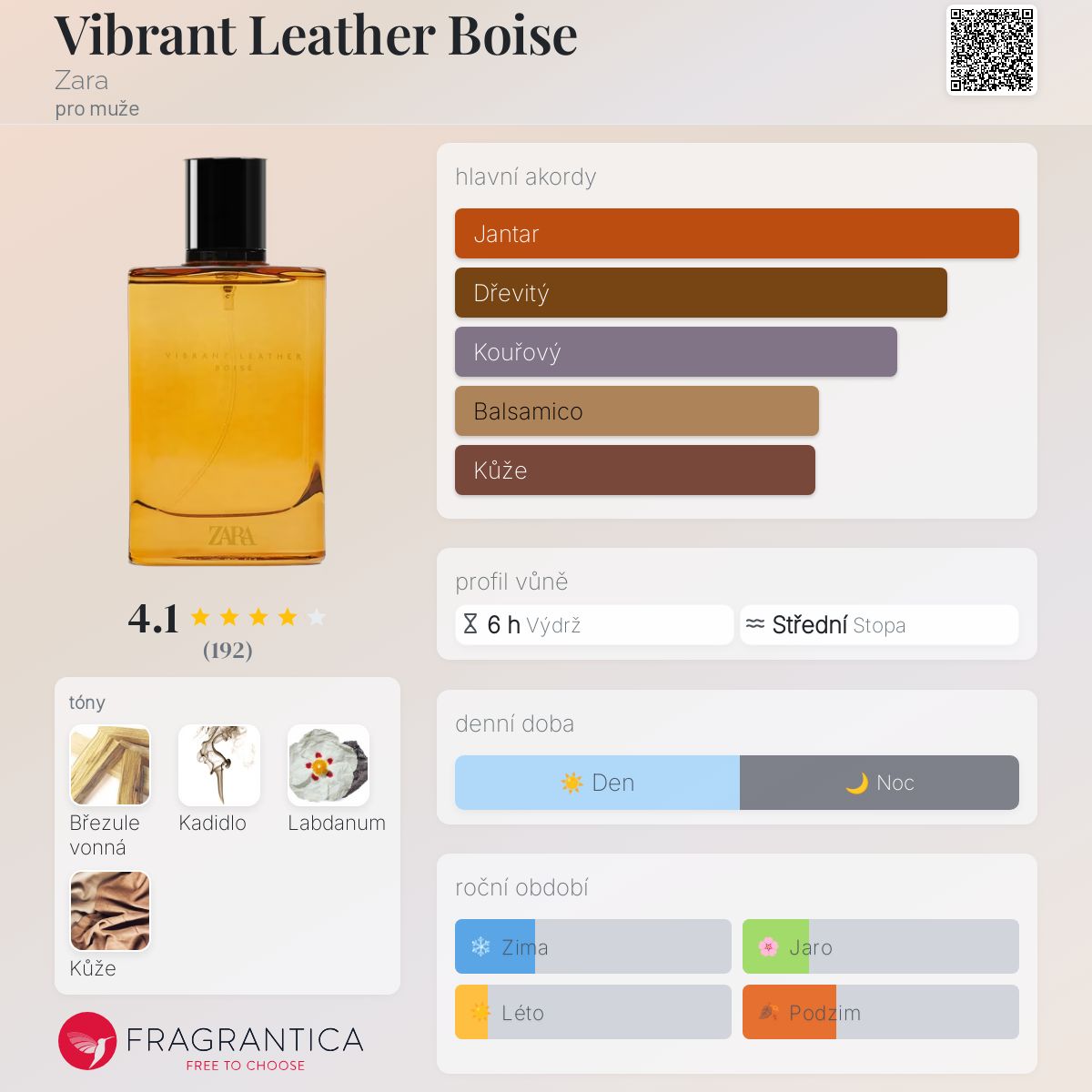 Vibrant Leather Boise podle Zara je Woody vůně pro muže. Vibrant Leather Boise byl/a uveden/a v roce 2021. Vrchní tón je Labdanum ; střední tón jeKadidlo ; základní tóny jsou Palo Santo a Kůže.