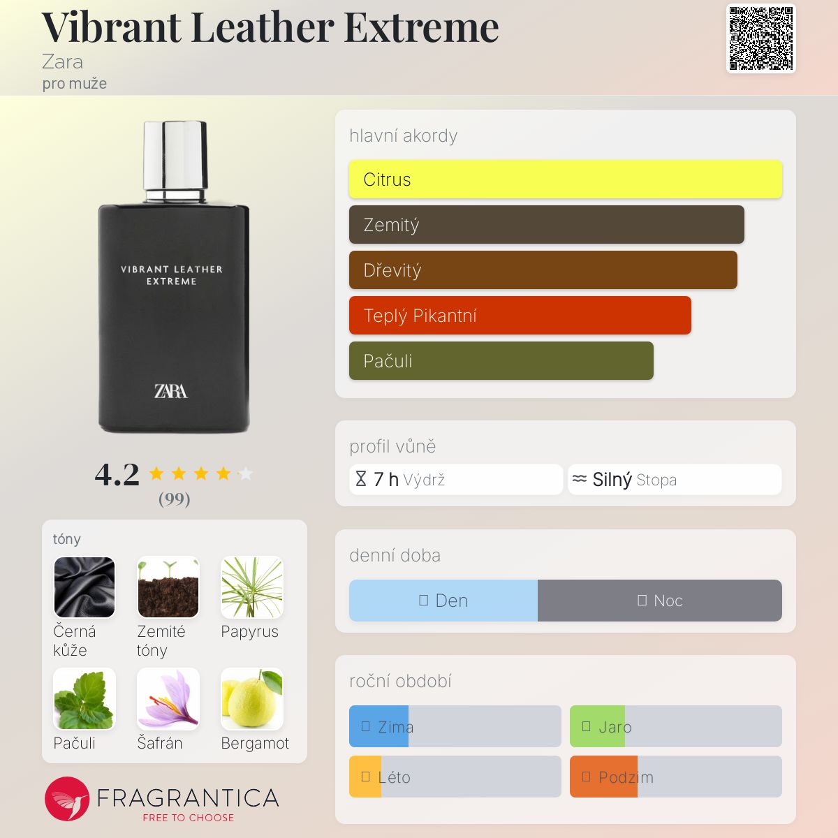 Vibrant Leather Extreme podle Zara je Orientální Woody vůně pro muže. Toto je nová vůně. Vibrant Leather Extreme byl/a uveden/a v roce 2024. "Nosem" za touto vůní je Jérôme Epinette. Vrchní tóny jsou Bergamot, Mandarinka a Citrón; střední tóny jsouČerná kůže a Šafrán ; základní tóny jsou Zemité tóny, Papyrus, Pačuli a Cukrová vata.
