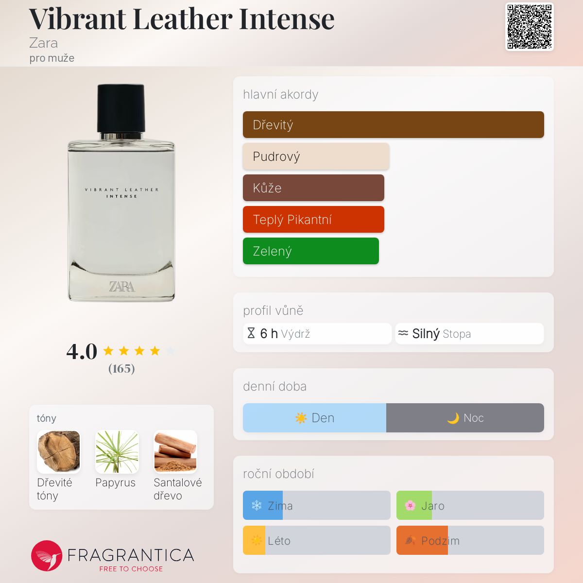 Vibrant Leather Intense podle Zara je Woody vůně pro muže. Vibrant Leather Intense byl/a uveden/a v roce 2021. "Nosem" za touto vůní je Jérôme Epinette. Vrchní tón je Dřevité tóny ; střední tón jePapyrus ; základní tón je Santalové dřevo.