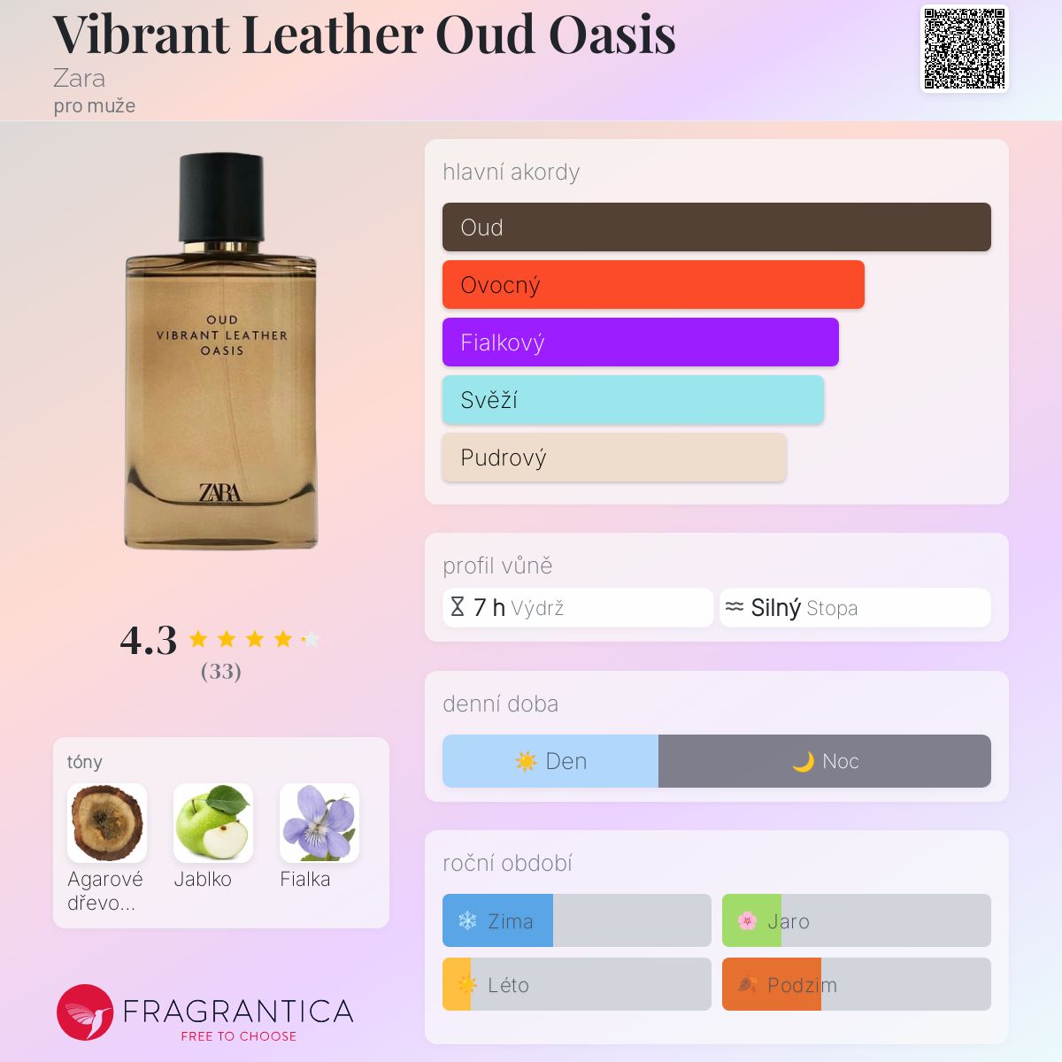 Vibrant Leather Oud Oasis podle Zara je Aromatic Fruity vůně pro muže. Toto je nová vůně. Vibrant Leather Oud Oasis byl/a uveden/a v roce 2025. Vrchní tón je Jablko ; střední tón jeFialka ; základní tón je Agarové dřevo (oud).