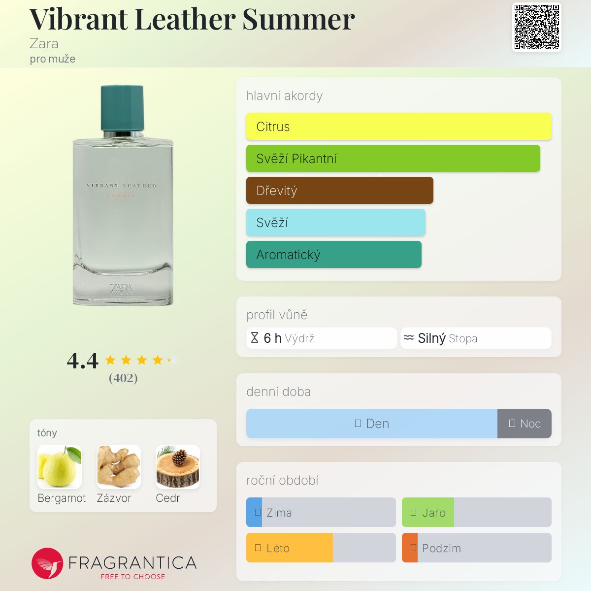 Vibrant Leather Summer podle Zara je Woody Aromatic vůně pro muže. Vibrant Leather Summer byl/a uveden/a v roce 2020. Vrchní tón je Bergamot ; střední tón jeZázvor ; základní tón je Cedr.