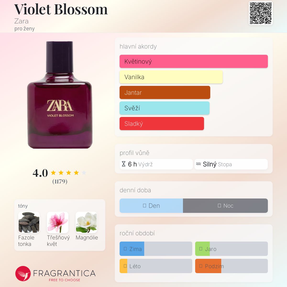 Violet Blossom podle Zara je Floral vůně pro ženy. Violet Blossom byl/a uveden/a v roce 2019. Vrchní tón je Třešňový květ ; střední tón jeMagnólie ; základní tón je Fazole tonka.