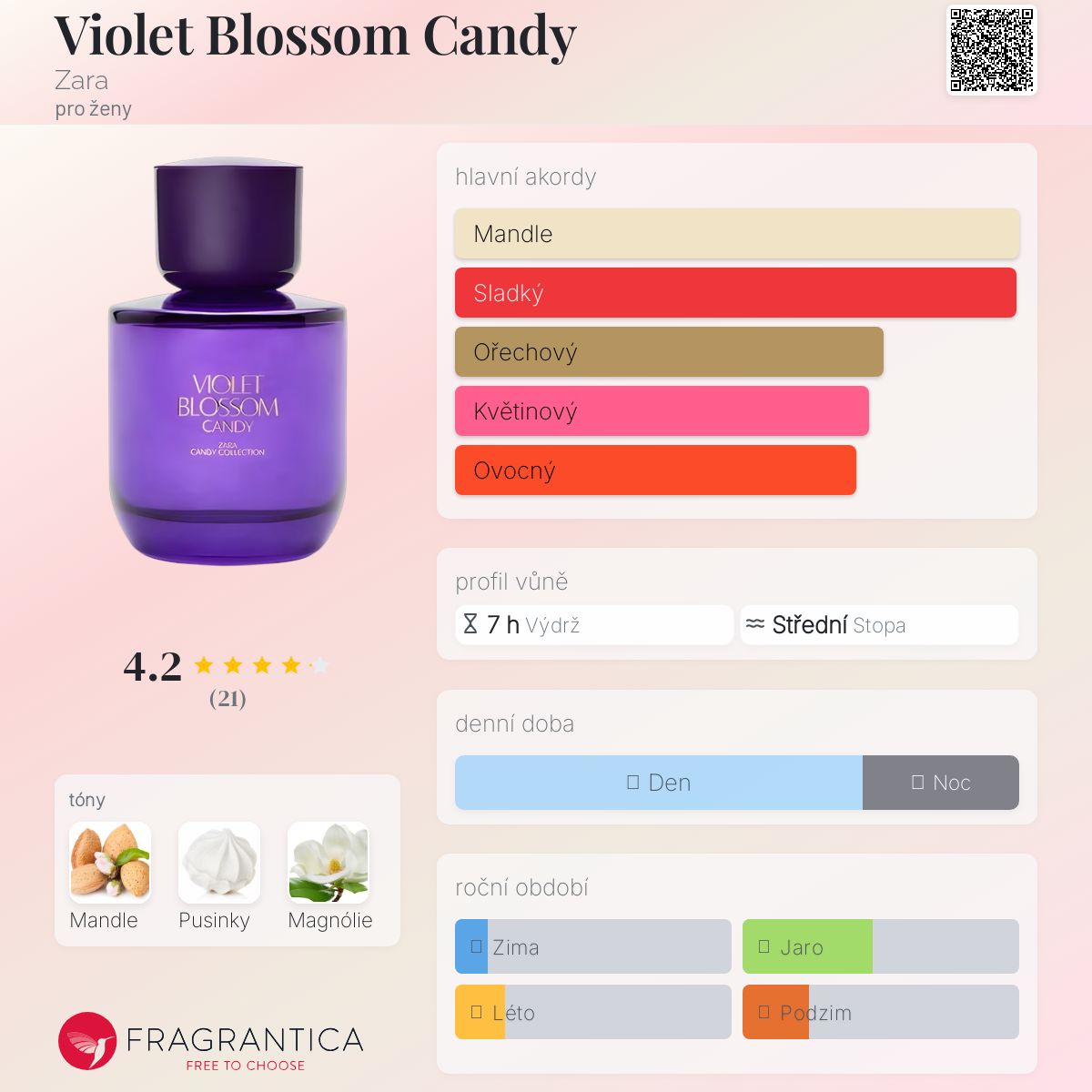 Violet Blossom Candy podle Zara je Floral Fruity Gourmand vůně pro ženy. Toto je nová vůně. Violet Blossom Candy byl/a uveden/a v roce 2025. Vrchní tón je Magnólie ; střední tón jeMandle ; základní tón je Sněhová pusinka.