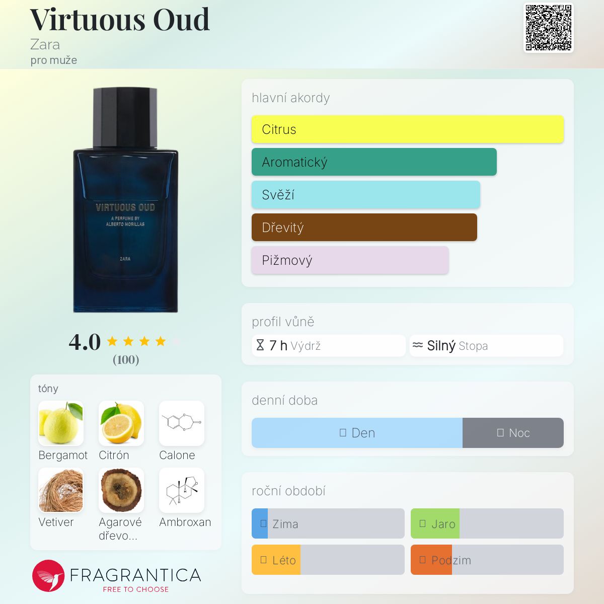 Virtuous Oud podle Zara je vůně pro muže. Virtuous Oud byl/a uveden/a v roce 2023. "Nosem" za touto vůní je Alberto Morillas. Vrchní tóny jsou Bergamot, Citrón a Calone; střední tóny jsouAgarové dřevo (oud), Ambroxan, Bílé pižmo, Květiny a Levandule ; základní tóny jsou Vetiver, Pačuli a Santalové dřevo.