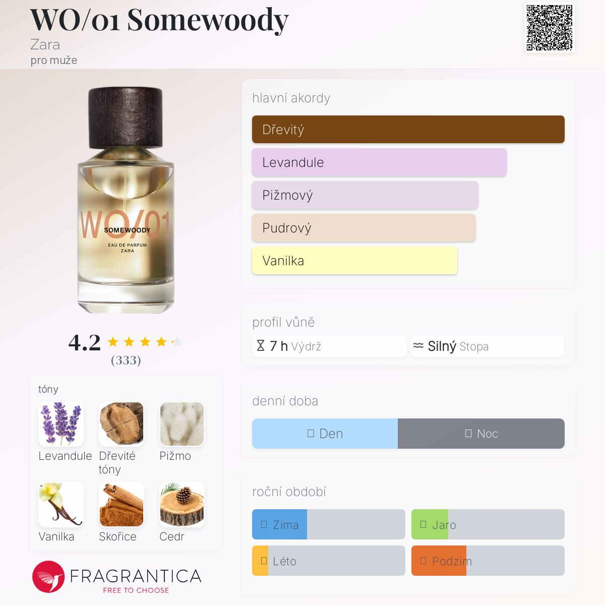 WO/01 Somewoody podle Zara je Orientální Woody vůně pro muže. WO/01 Somewoody byl/a uveden/a v roce 2023. Vrchní tóny jsou Levandule a Skořice; střední tóny jsouPižmo, Cedr a Bílé květy ; základní tóny jsou Dřevité tóny, Vanilka a Jantar (ambra).