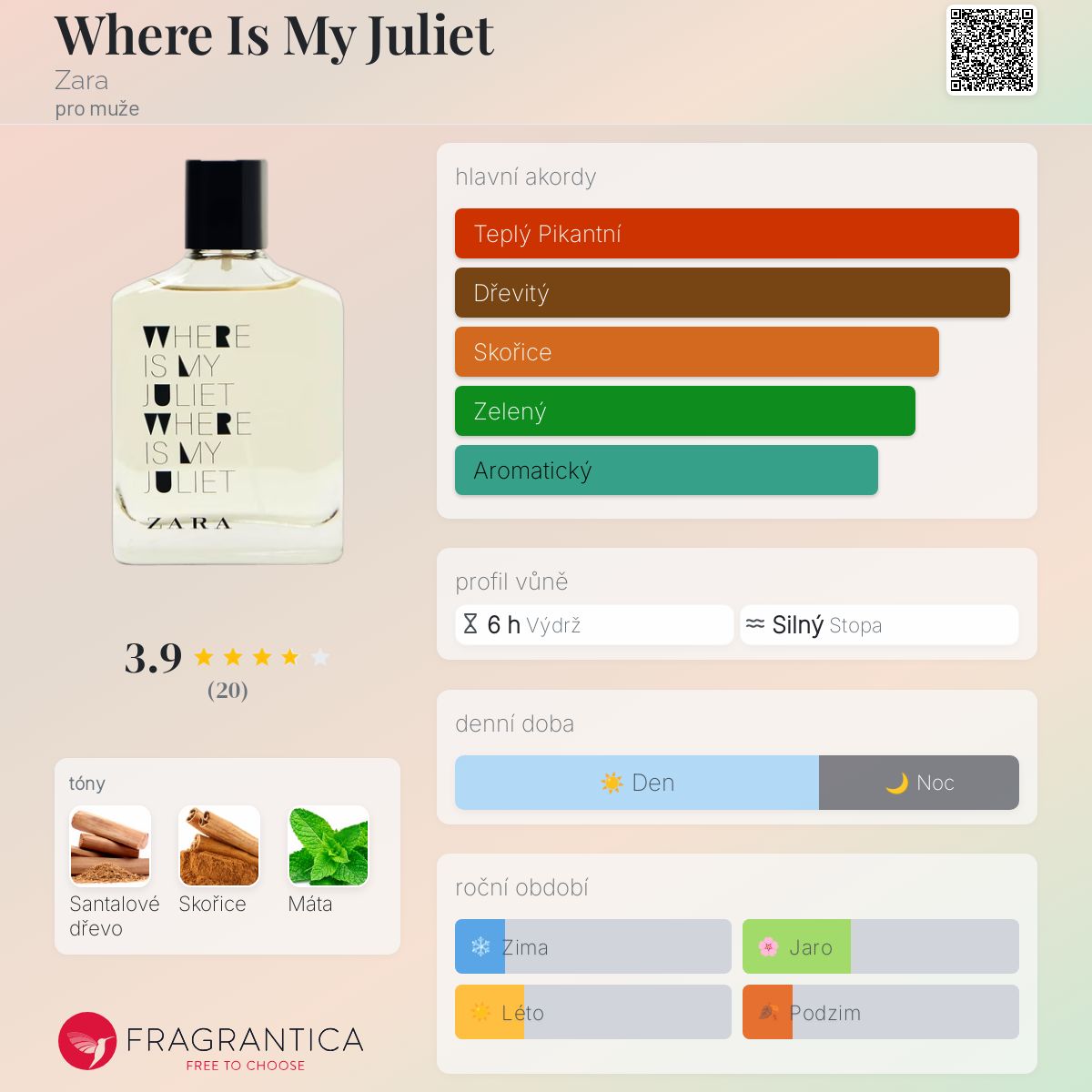 Where Is My Juliet podle Zara je Woody Spicy vůně pro muže. Where Is My Juliet byl/a uveden/a v roce 2018. Vrchní tón je Máta ; střední tón jeSkořice ; základní tón je Santalové dřevo.