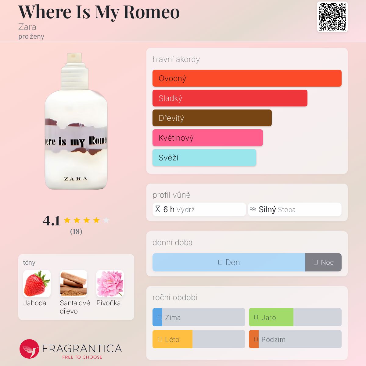 Where Is My Romeo podle Zara je Floral Fruity vůně pro ženy. Where Is My Romeo byl/a uveden/a v roce 2018. Vrchní tón je Jahoda ; střední tón jePivoňka ; základní tón je Santalové dřevo.