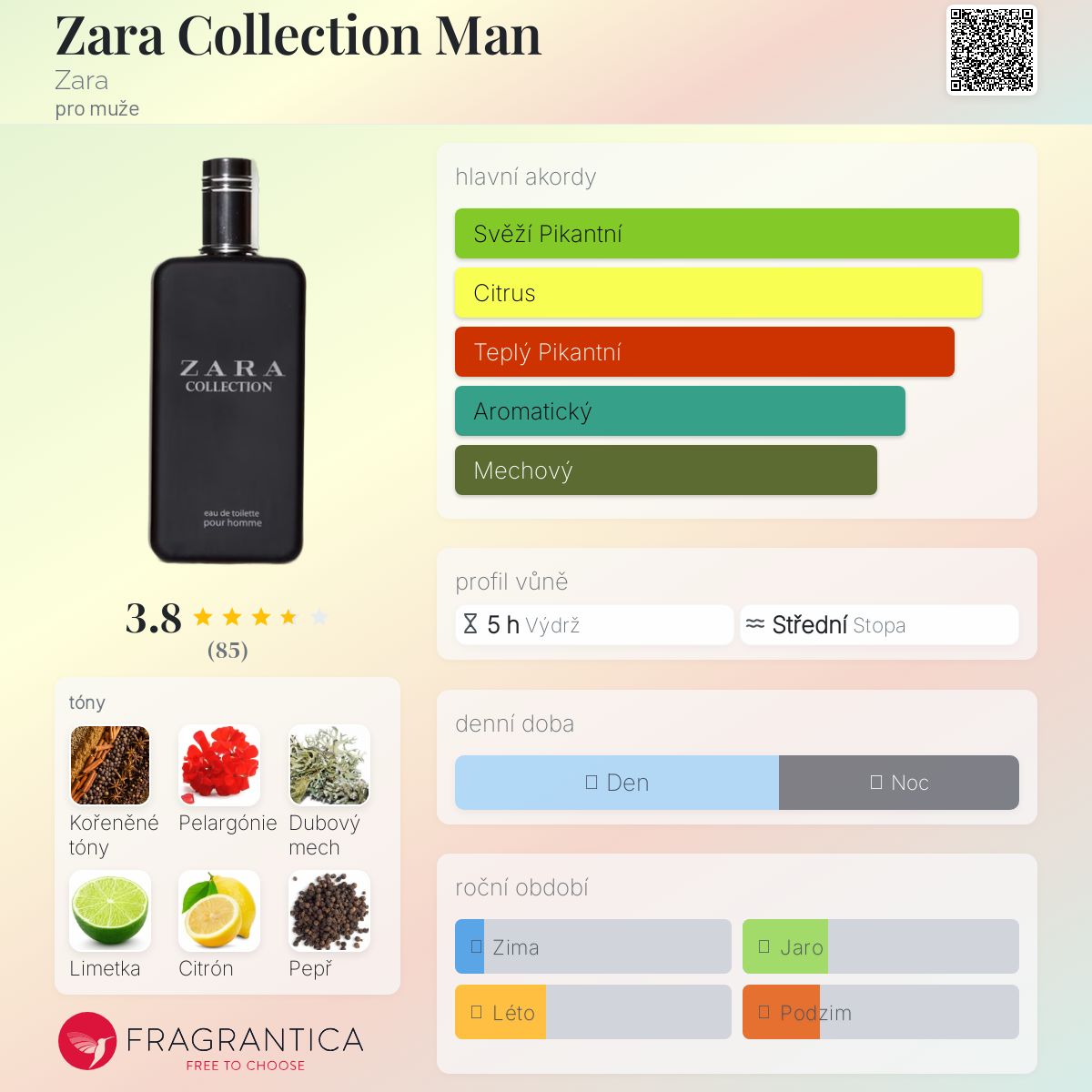 Zara Collection Man podle Zara je Aromatic Fougere vůně pro muže. Vrchní tóny jsou Limetka a Citrón; střední tóny jsouKořeněné tóny a Pelargónie ; základní tóny jsou Mech a Pepř.