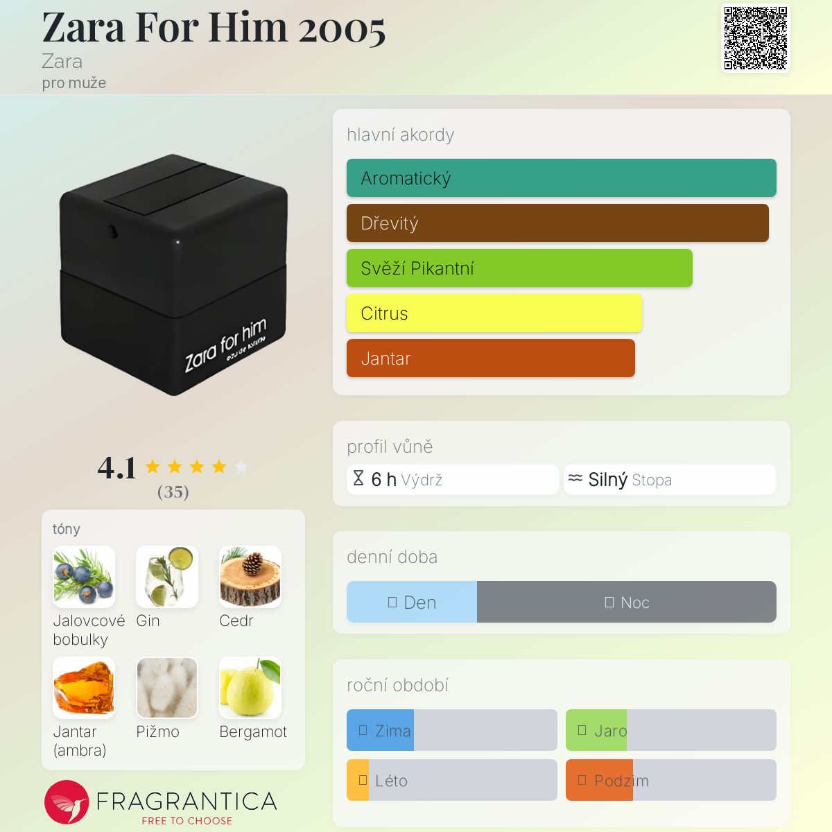 Zara For Him 2005 podle Zara je Citrus Aromatic vůně pro muže. Zara For Him 2005 byl/a uveden/a v roce 2005. "Nosem" za touto vůní je Rosendo Mateu. Vrchní tóny jsou Jalovcové bobulky, Bergamot a Citron amalfi; střední tóny jsouGin a Muškátový oříšek ; základní tóny jsou Virginský cedr, Jantar (ambra) a Pižmo.