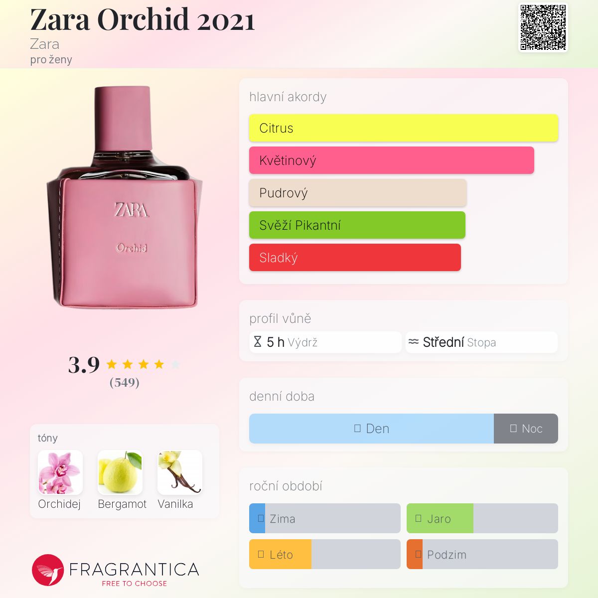 Zara Orchid 2021 podle Zara je Orientální Floral vůně pro ženy. Zara Orchid 2021 byl/a uveden/a v roce 2021. Vrchní tón je Bergamot ; střední tón jeOrchidej ; základní tón je Vanilka.