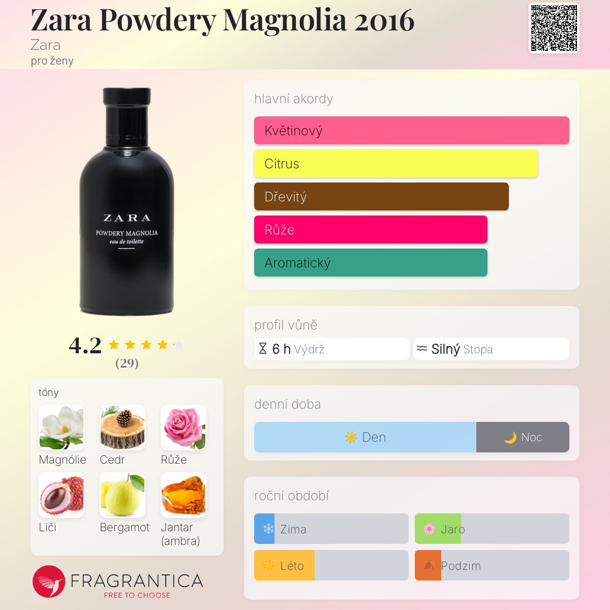 Zara Powdery Magnolia 2016 podle Zara je Floral vůně pro ženy. Zara Powdery Magnolia 2016 byl/a uveden/a v roce 2016. Vrchní tóny jsou Liči, Bergamot a Estragon; střední tóny jsouMagnólie a Růže ; základní tóny jsou Cedr a Jantar (ambra).