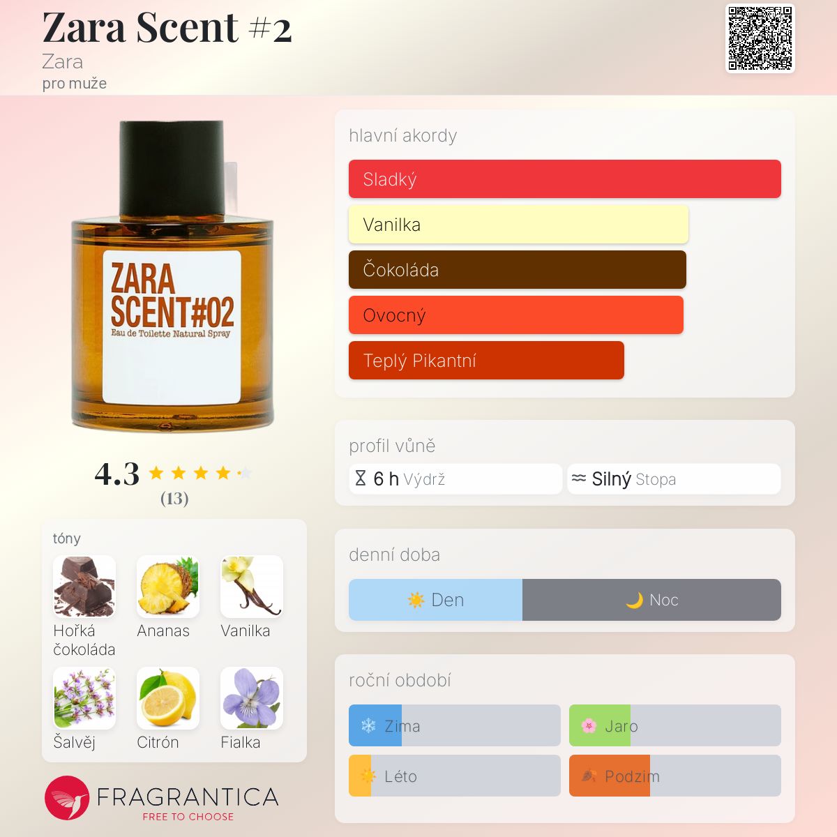 Zara Scent #2 podle Zara je Floral Fruity Gourmand vůně pro muže. Zara Scent #2 byl/a uveden/a v roce 2015. Vrchní tóny jsou Šalvěj a Citrón; střední tóny jsouAnanas a Fialka ; základní tóny jsou Hořká čokoláda a Vanilka.