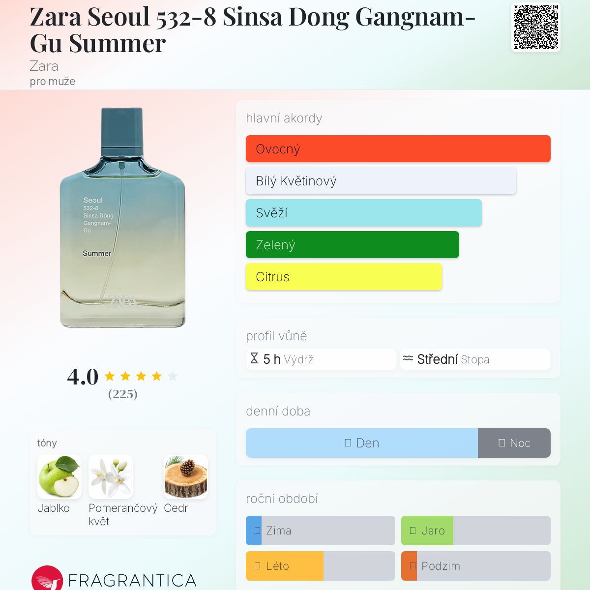 Zara Seoul 532-8 Sinsa Dong Gangnam-Gu Summer podle Zara je Floral Fruity vůně pro muže. Zara Seoul 532-8 Sinsa Dong Gangnam-Gu Summer byl/a uveden/a v roce 2020. Vrchní tón je Jablko ; střední tón jePomerančový květ ; základní tón je Cedr.