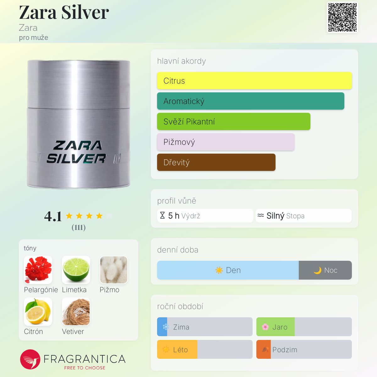 Zara Silver podle Zara je Citrus Aromatic vůně pro muže. Vrchní tóny jsou Limetka a Citrón; střední tón jePelargónie ; základní tóny jsou Pižmo a Vetiver.