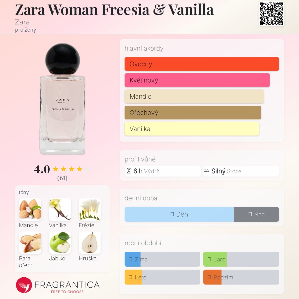 Zara Woman Freesia & Vanilla podle Zara je Orientální Floral vůně pro ženy. Zara Woman Freesia & Vanilla byl/a uveden/a v roce 2015. Vrchní tóny jsou Jablko a Hruška; střední tóny jsouMandle a Frézie ; základní tóny jsou Vanilka a Para ořech.