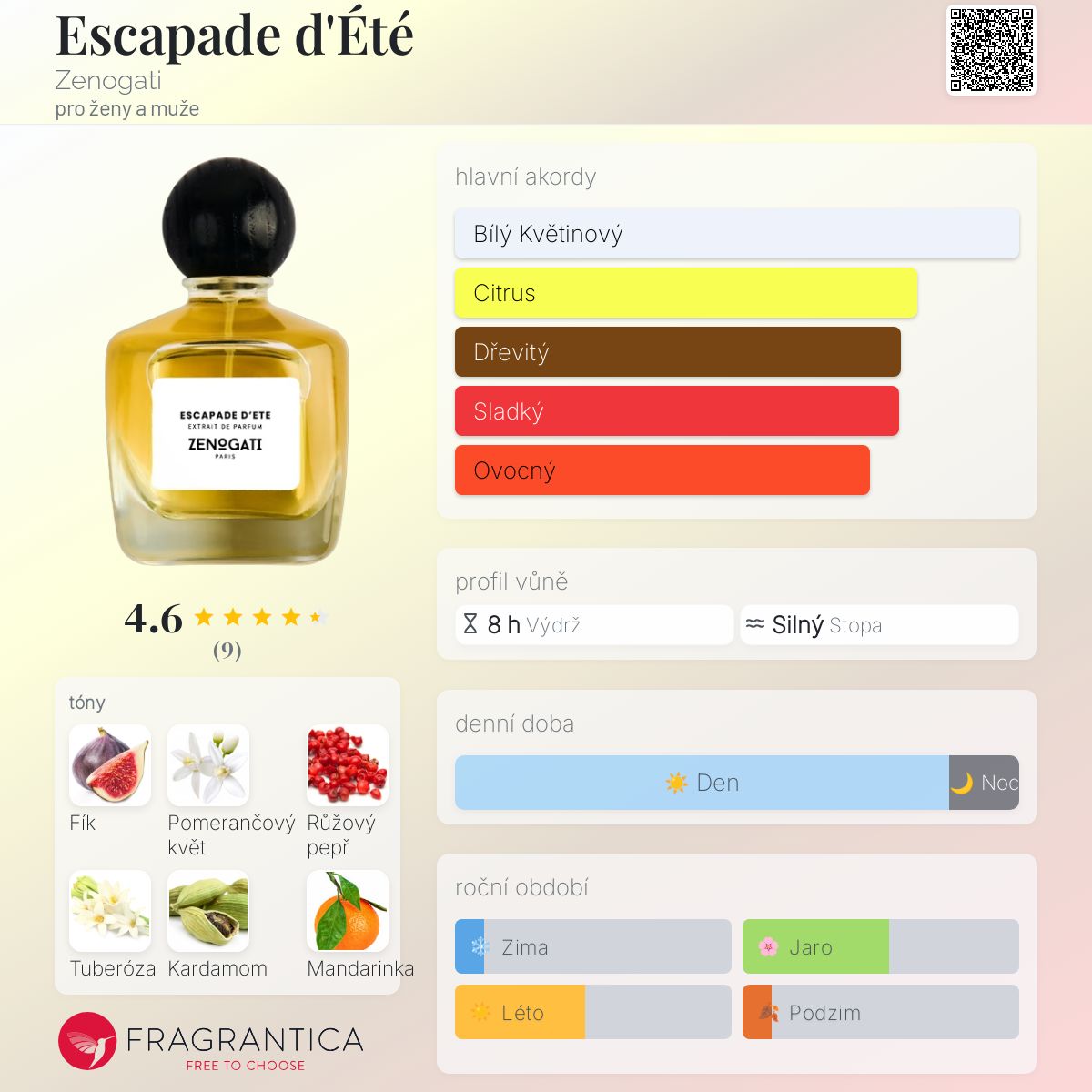 Escapade d'Été podle Zenogati je Woody Floral Musk vůně pro ženy a muže. Toto je nová vůně. Escapade d'Été byl/a uveden/a v roce 2025. "Nosem" za touto vůní je Helene Vonesch. Vrchní tóny jsou Mandarinka, Fík a Kardamom; střední tóny jsouPomerančový květ, Růžový pepř a Tuberóza ; základní tóny jsou Guajakové dřevo, Vetiver a Santalové dřevo.