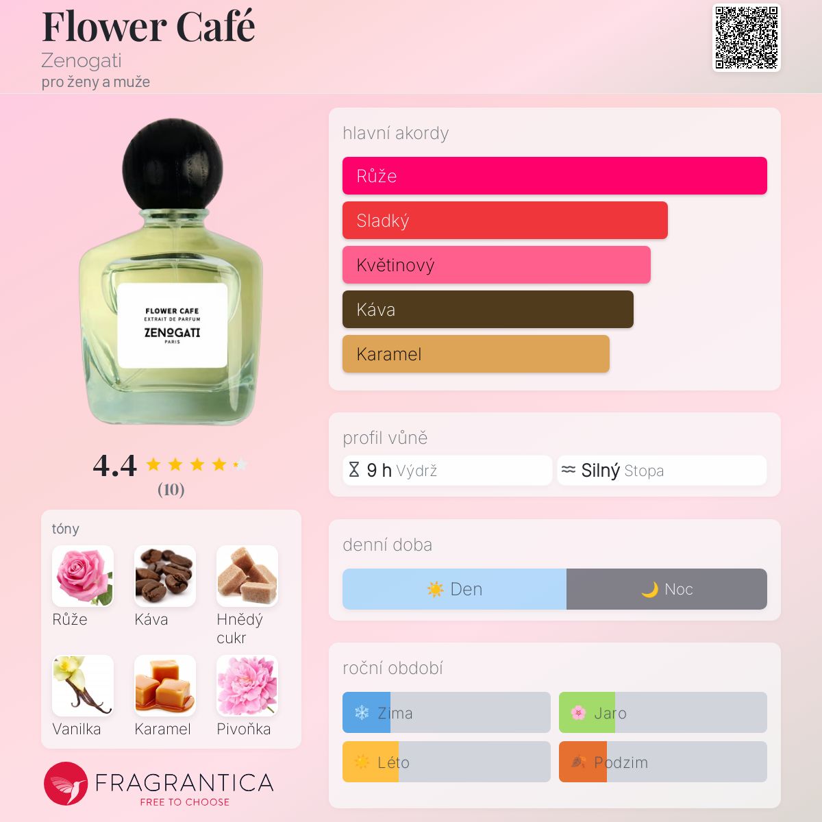 Flower Café podle Zenogati je Floral Fruity Gourmand vůně pro ženy a muže. Toto je nová vůně. Flower Café byl/a uveden/a v roce 2024. "Nosem" za touto vůní je Sebastien Lacouture. Vrchní tóny jsou Vanilka, Karamel a Pivoňka; střední tóny jsouRůže, Káva a Jantar (ambra) ; základní tóny jsou Hnědý cukr a Santalové dřevo.