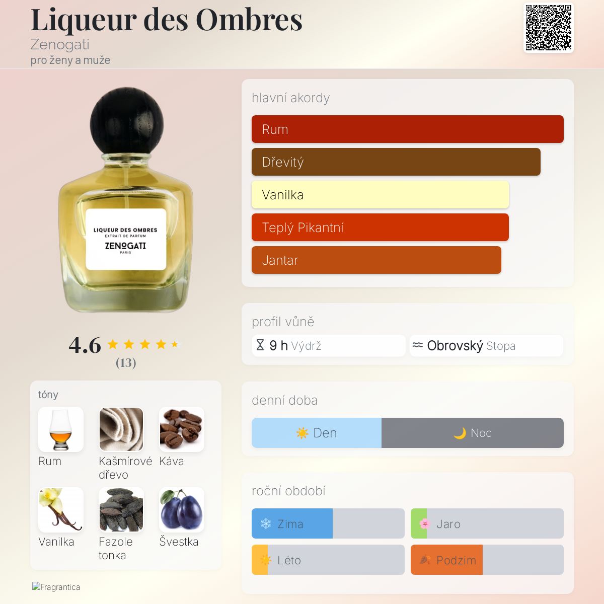Liqueur des Ombres podle Zenogati je Orientální Vanilla vůně pro ženy a muže. Toto je nová vůně. Liqueur des Ombres byl/a uveden/a v roce 2025. "Nosem" za touto vůní je Hélène Vonesch. Vrchní tóny jsou Kašmírové dřevo, Káva a Švestka; střední tóny jsouRum, Madagaskarská vanilka a Fazole tonka ; základní tóny jsou Jantar (ambra), Cedr a Pižmo.