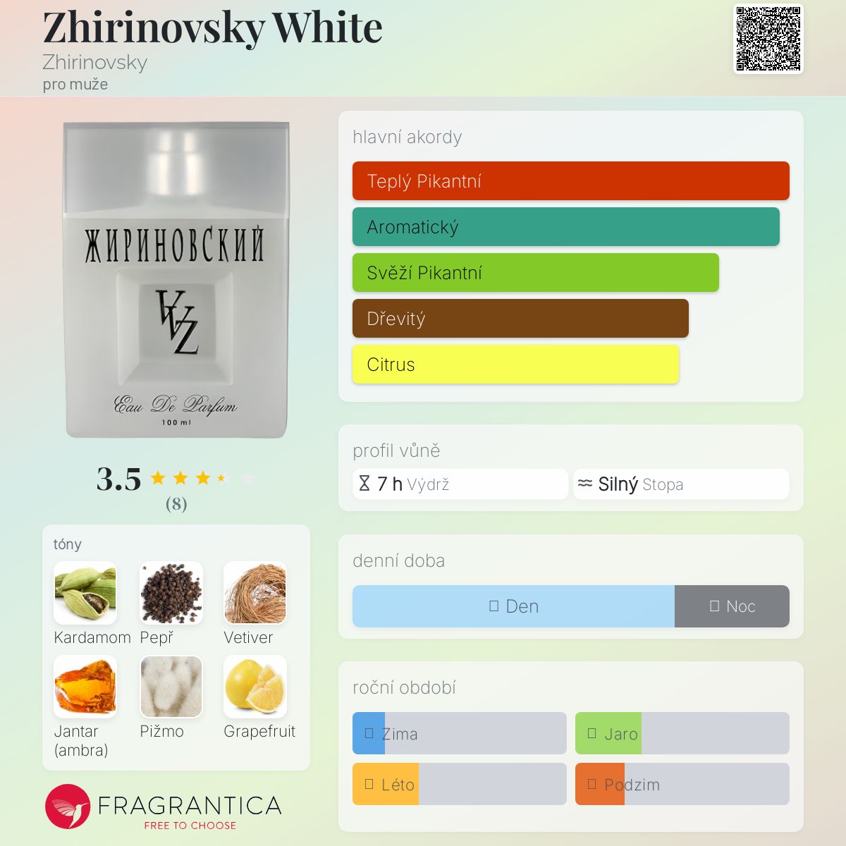 Zhirinovsky White podle Zhirinovsky je Woody vůně pro muže. Zhirinovsky White byl/a uveden/a v roce 2010. Vrchní tóny jsou Grapefruit, Bergamot a Mandarinka; střední tóny jsouKardamom, Bílý pepř a Cedr ; základní tóny jsou Vetiver, Jantar (ambra) a Pižmo.