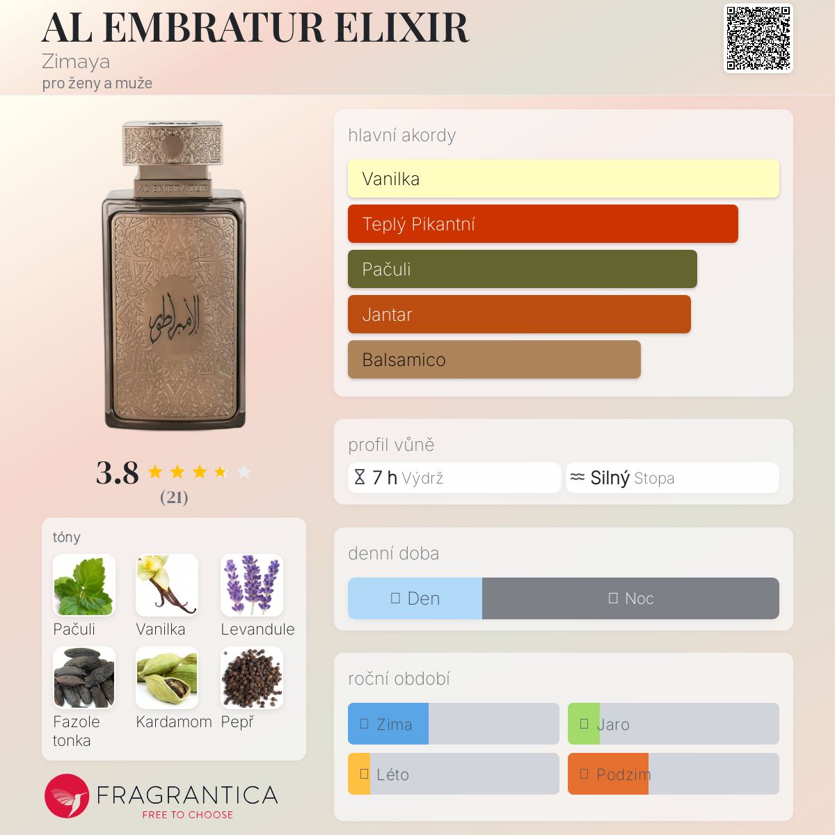 AL EMBRATUR ELIXIR podle Zimaya je Woody Spicy vůně pro ženy a muže. Toto je nová vůně. AL EMBRATUR ELIXIR byl/a uveden/a v roce 2024. Vrchní tóny jsou Levandule, Kardamom a Pepř; střední tóny jsouPačuli a Kadidlo ; základní tóny jsou Vanilka, Fazole tonka, Jantar (ambra) a Pižmo.