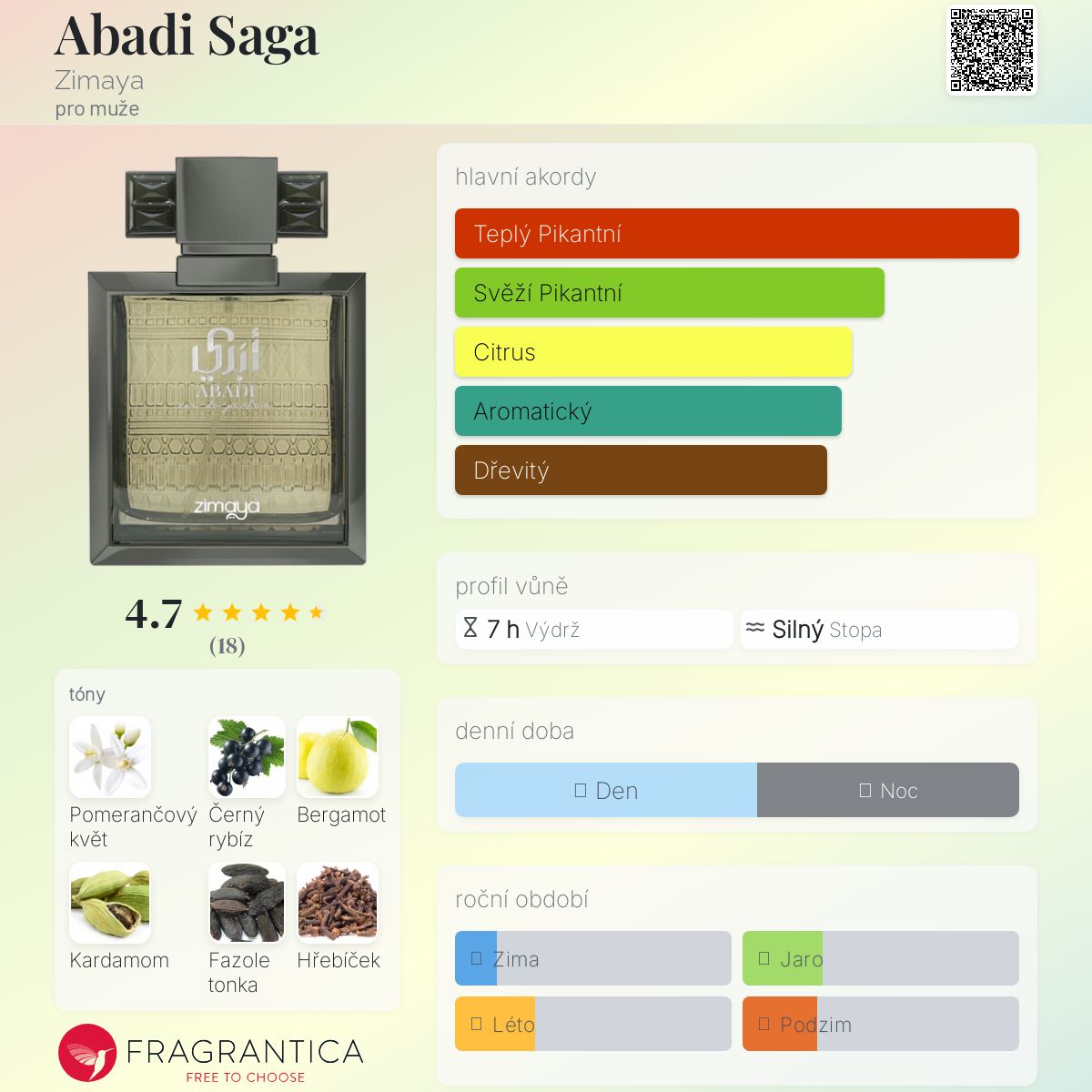Abadi Saga podle Zimaya je Woody Spicy vůně pro muže. Toto je nová vůně. Abadi Saga byl/a uveden/a v roce 2025. Vrchní tóny jsou Pomerančový květ, Černý rybíz, Bergamot a Hřebíček; střední tóny jsouKardamom, Skořice, Zázvor, Pačuli a Růže ; základní tóny jsou Fazole tonka, Pepř, Dubový mech, Santalové dřevo, Vetiver a Pižmo.